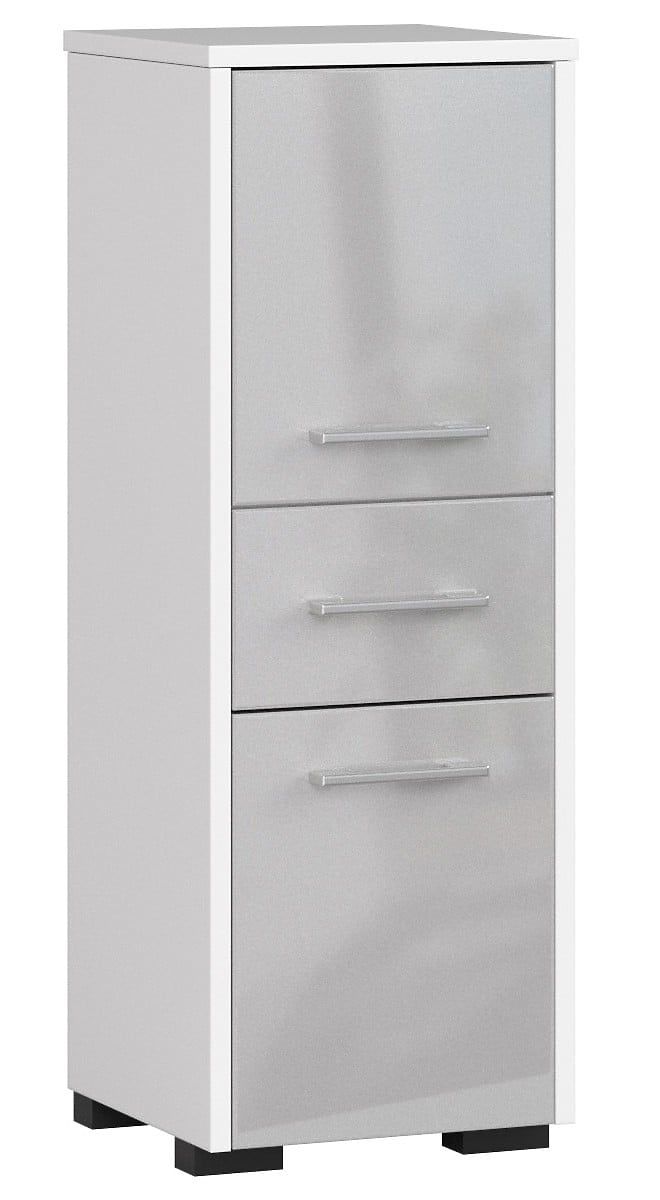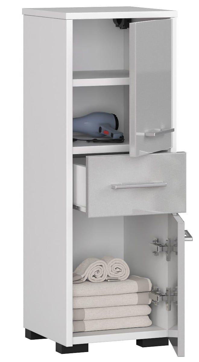 Coloana de baie FIN cu un sertar și două uși rabatabile este realizată din placă de mobilier laminată de înaltă calitate, rezistentă la abraziune, Kronospan. Corpul alb al mobilierului se potrivește perfect cu fațadele cu suprafață acrilică de înaltă luciu în culoare metalică. Sub placa coloanei este amplasat un dulap cu două rafturi și uși. Mai jos se află un sertar și sub el un alt dulap – de data aceasta cu un singur raft. Dulapul de baie elegant este completat de mânere interesante, confortabile și simple.