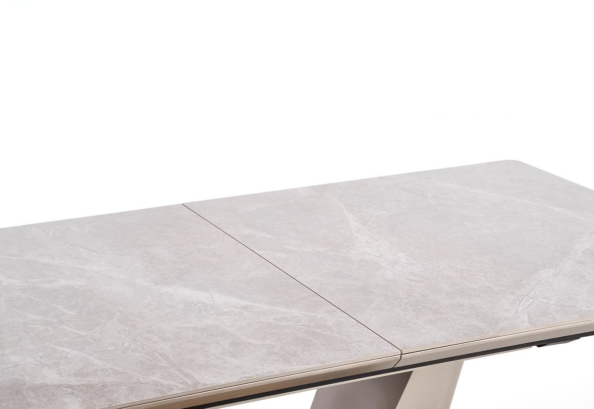 Masa de dining extensibilă VALENTINO de la brandul Halmar este întruchiparea eleganței moderne, luxului și funcționalității. Datorită designului său exclusivist, devine elementul dominant al oricărei săli de mese sau bucătării amenajate într-un stil modern, glamour sau reprezentativ. Blatul dreptunghiular cu colțuri rotunjite și margini teșite este realizat din MDF de calitate acoperit cu furnir de marmură gri deschis, care conferă mesei un aspect sofisticat și atemporal. Un avantaj practic este mecanismul extensibil, datorită căruia masa poate fi ușor extinsă – după extindere, suprafața este completată cu două plăci ceramice lăcuite în nuanță de gri. Masa oferă astfel confortabil loc pentru până la 8 persoane. Stabilitatea este asigurată de un suport masiv din oțel în formă de V, care este decorat în partea inferioară cu un element auriu. Accentele aurii se repetă și pe baza ovală a mesei și împreună cu finisajul gri creează un contrast luxos și armonios. Masa VALENTINO este alegerea ideală pentru cei care caută o masă de dining design, robustă și practică, care să se adapteze atât utilizării zilnice, cât și ocaziilor festive.