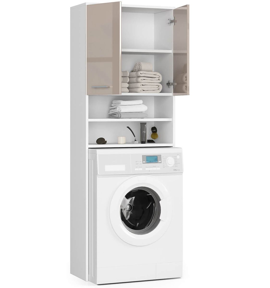 Dulap de baie alb-cappuccino lucios deasupra mașinii de spălat. .. mai mult