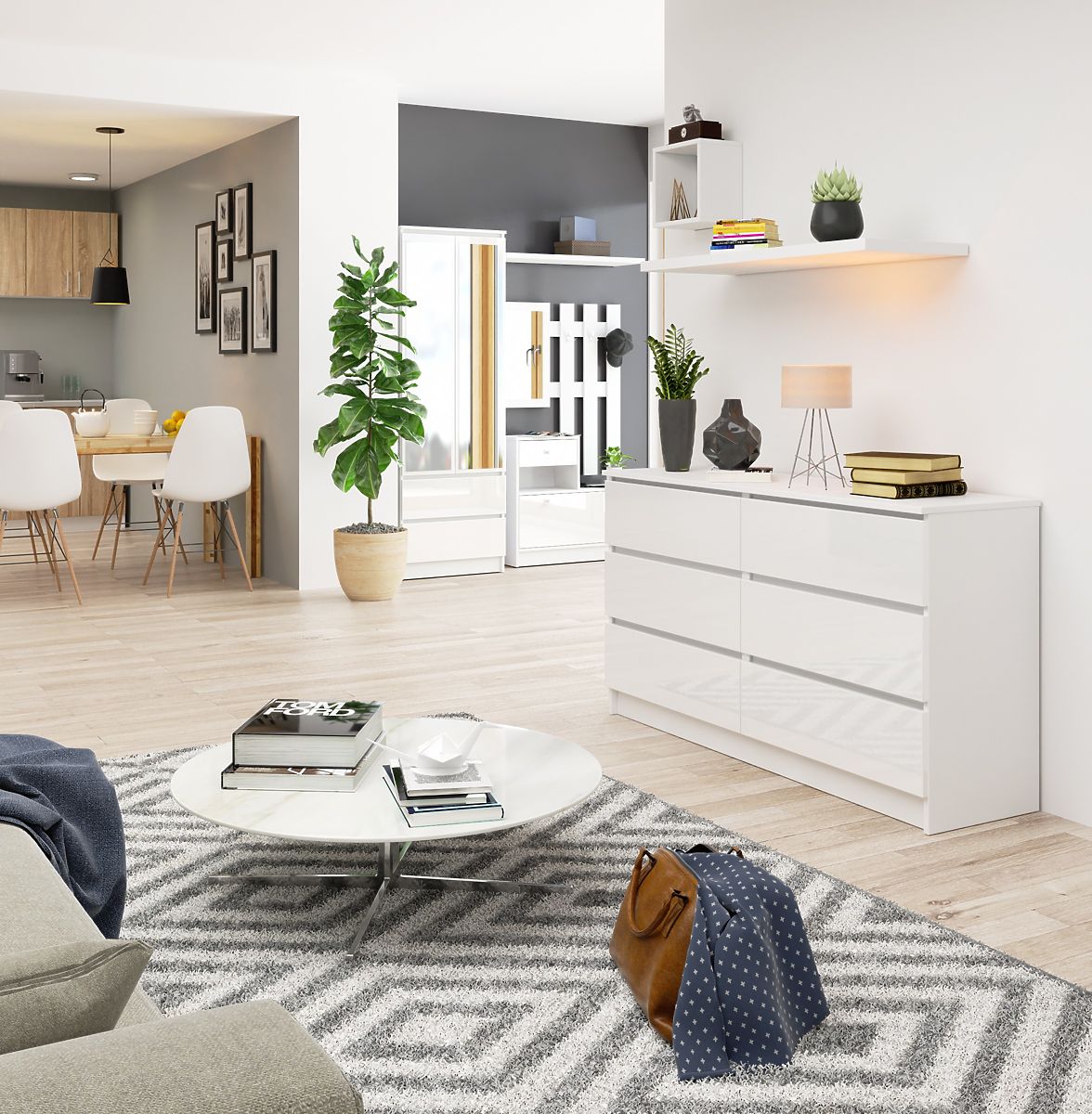 Comodă albă cu 6 sertare și fronturi lucioase. .. mai mult