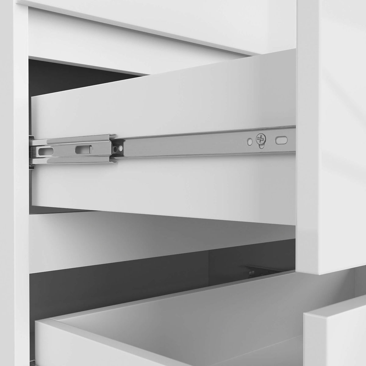 Adâncime - 40 cm- Corpul comodei este realizat din placă laminată de 16 mm alb mat rezistentă la abraziune - Fronturile sunt realizate din placă ACRILIC de 19 mm în decor alb cu luciu ridicat