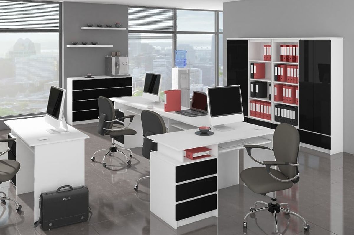 Corpul comodei este realizat din plăci laminate de 16 mm, alb semi-mat, fronturile sunt realizate din plăci ACRIL decor Negru 19 mm luciu înalt.
