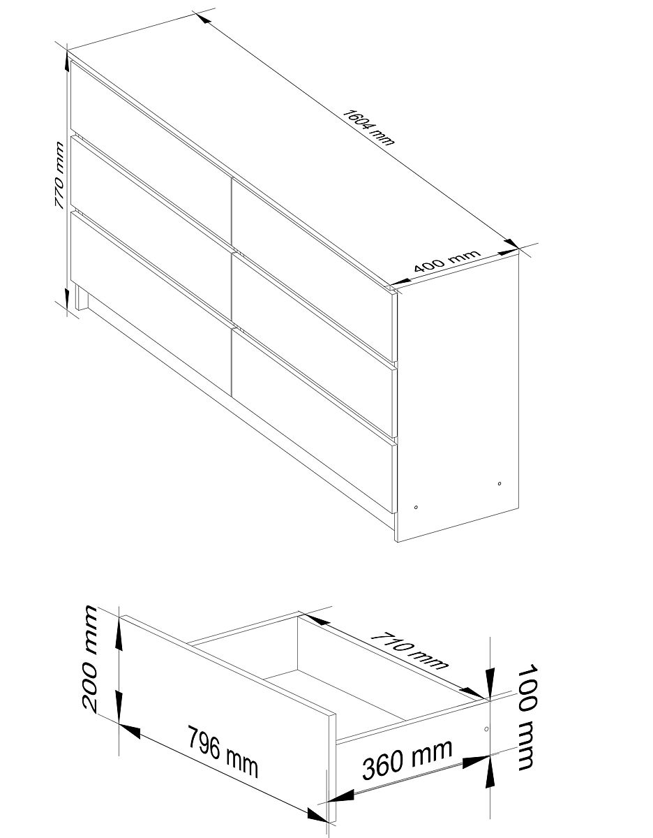 - Corpul comodei este realizat din placă laminată alb mat de 16 mm rezistentă la abraziune