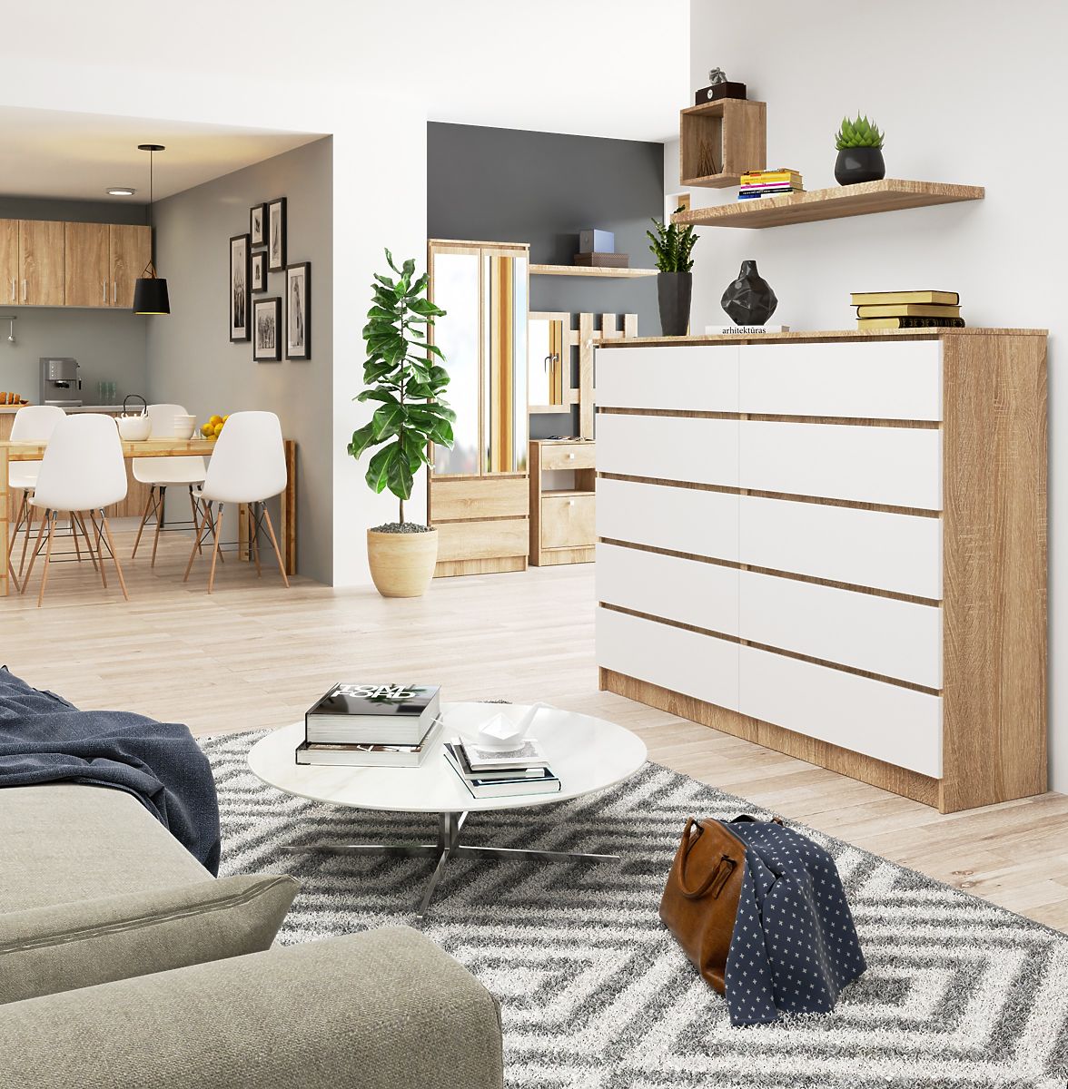 Comodă spațioasă cu 10 sertare, design modern stejar sonoma și alb. .. mai mult
