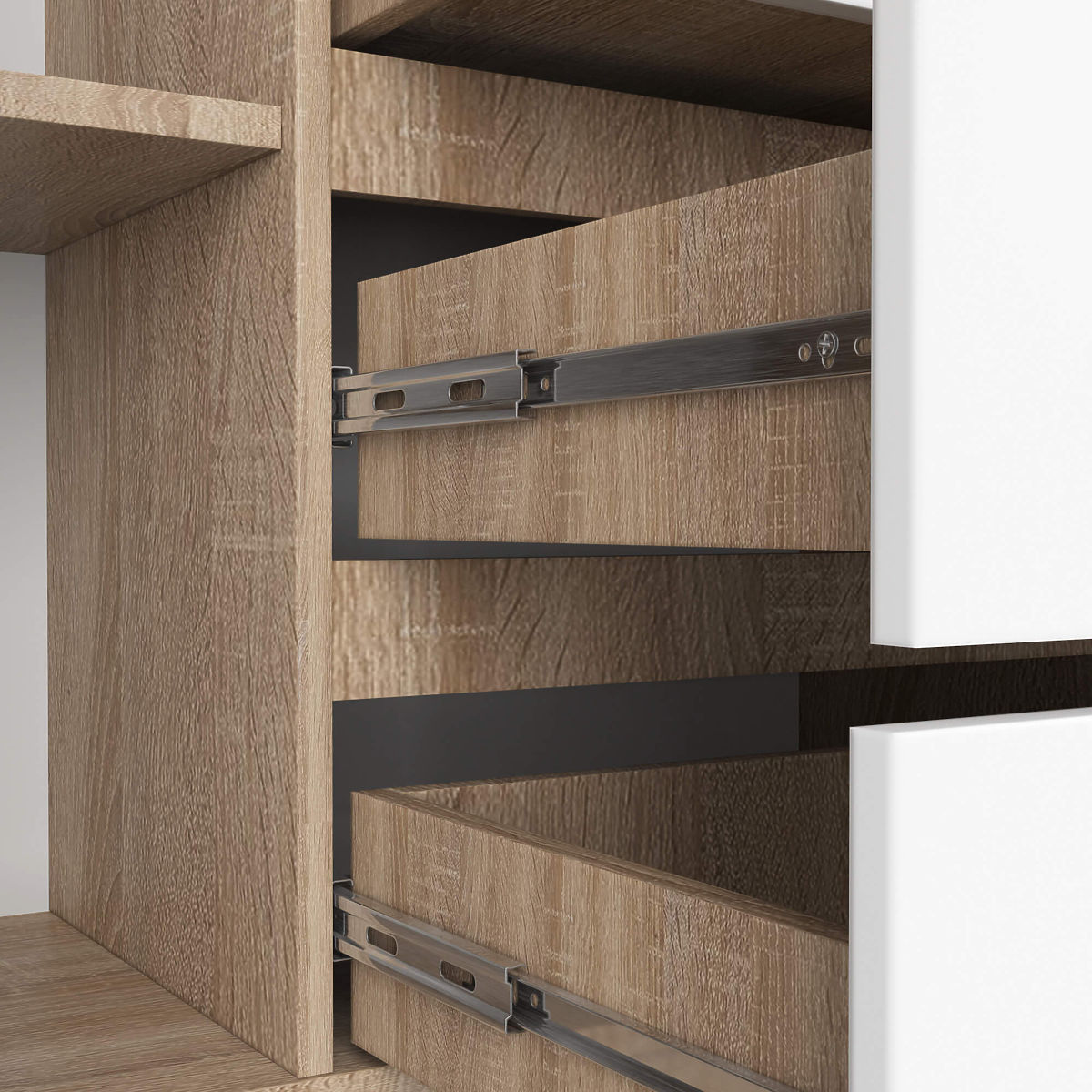 - Sertarele se mișcă pe șine metalice cu bile - Marginile acoperite cu bandă ABS care asigură o protecție ridicată împotriva deteriorării
