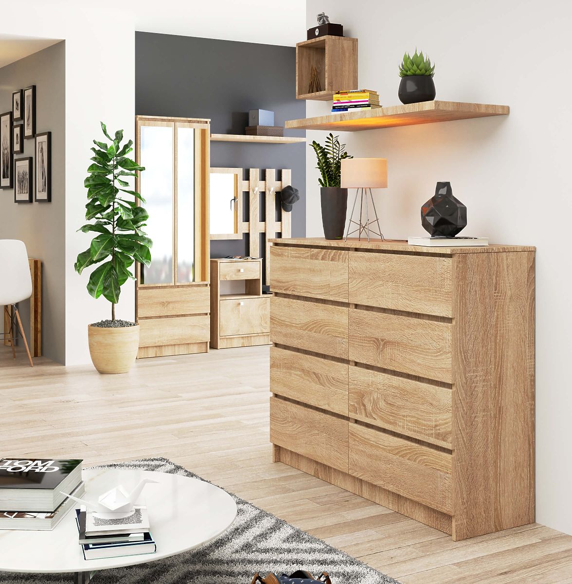 - Comodă fabricată din placă laminată rezistentă la abraziune