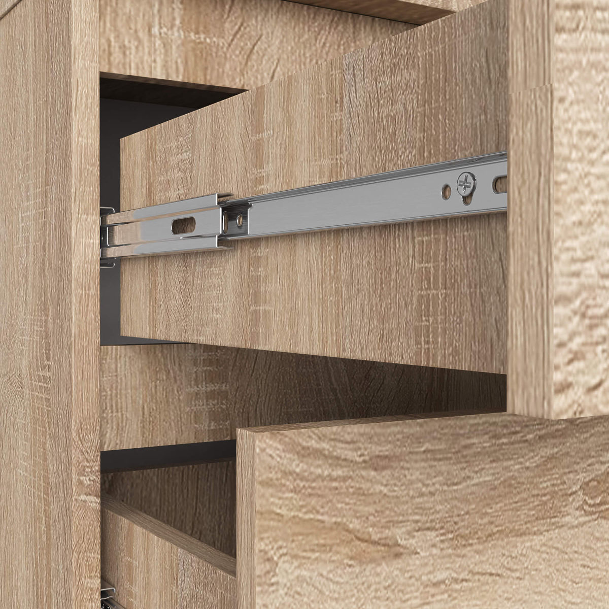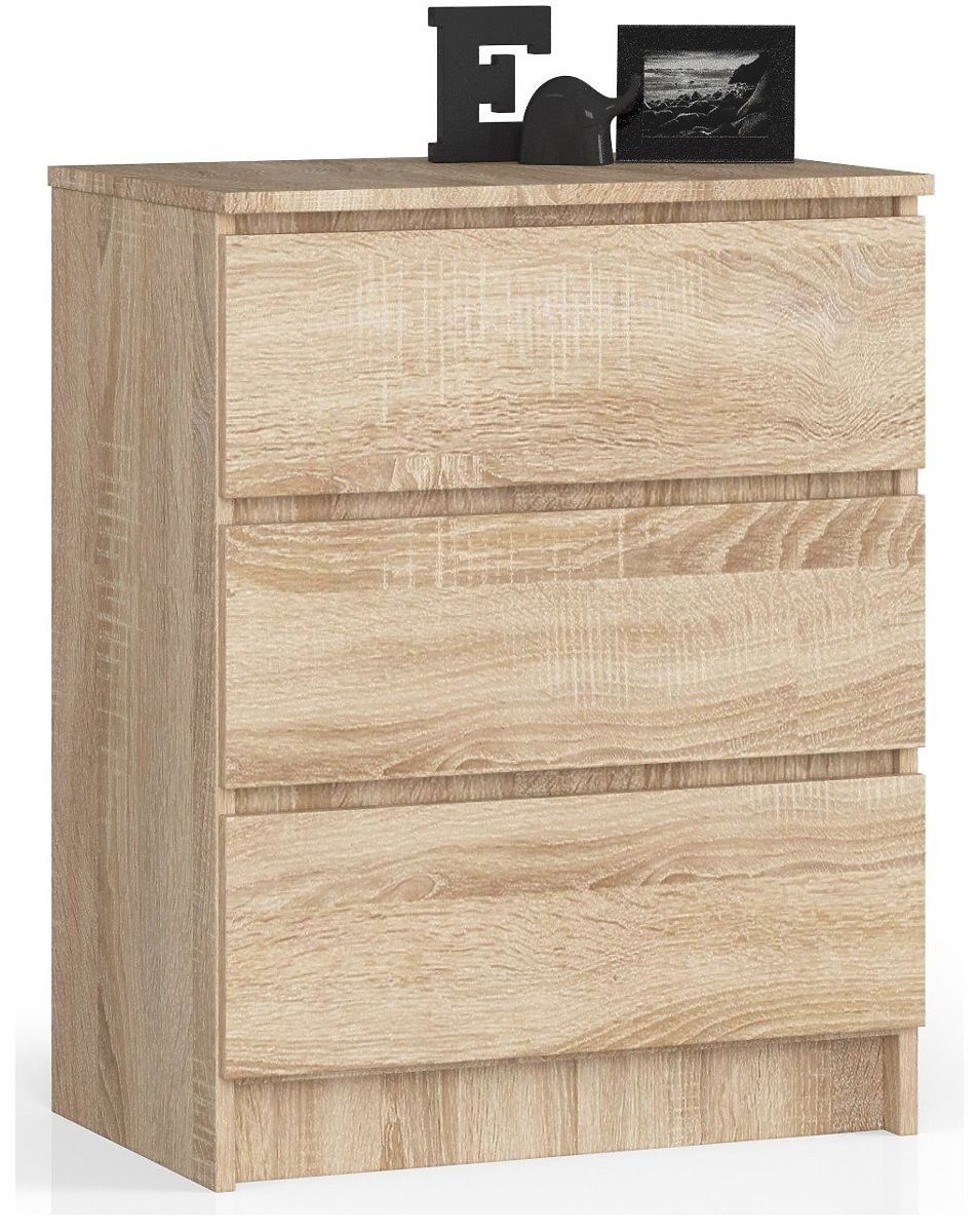 O comodă mică, dar spațioasă, cu trei sertare, a cărei finisare va satisface așteptările clienților exigenți. A fost utilizat stejarul sonoma, o culoare care se potrivește perfect cu interioarele luminoase. Produsul este potrivit pentru dormitor, living, cameră sau hol - totul depinde de nevoile clienților noștri. Oferim o piesă fabricată din placă laminată cu o grosime de până la 16 milimetri. Este un material rezistent la uzură, care este, de asemenea, întărit cu cant ABS. Modelul utilizează sertare care se mișcă pe șine metalice cu bile, asigurând o funcționare lină, delicată și precisă.