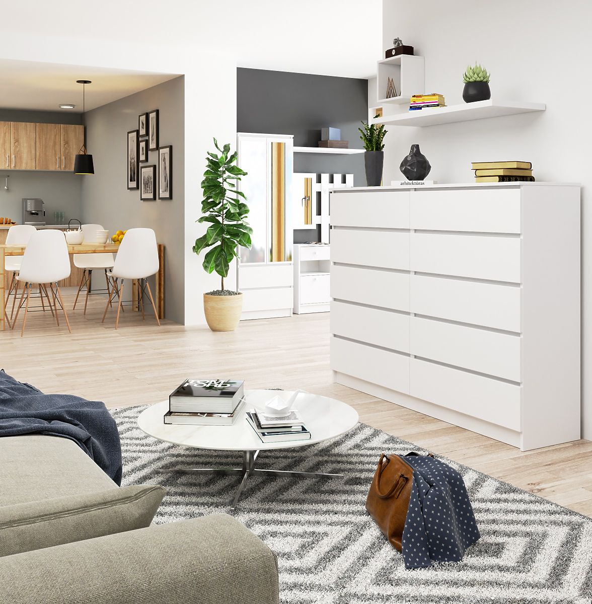 Comoda este echipată cu zece sertare spațioase, care pot găzdui toate obiectele necesare. Culoarea albă universală și atemporală permite combinarea comodei cu diferite tipuri de mobilier în diverse nuanțe de culoare. Produsul este fabricat din placă laminată cu grosimea de 16 milimetri rezistentă la abraziune. Marginile sunt acoperite cu bandă ABS.