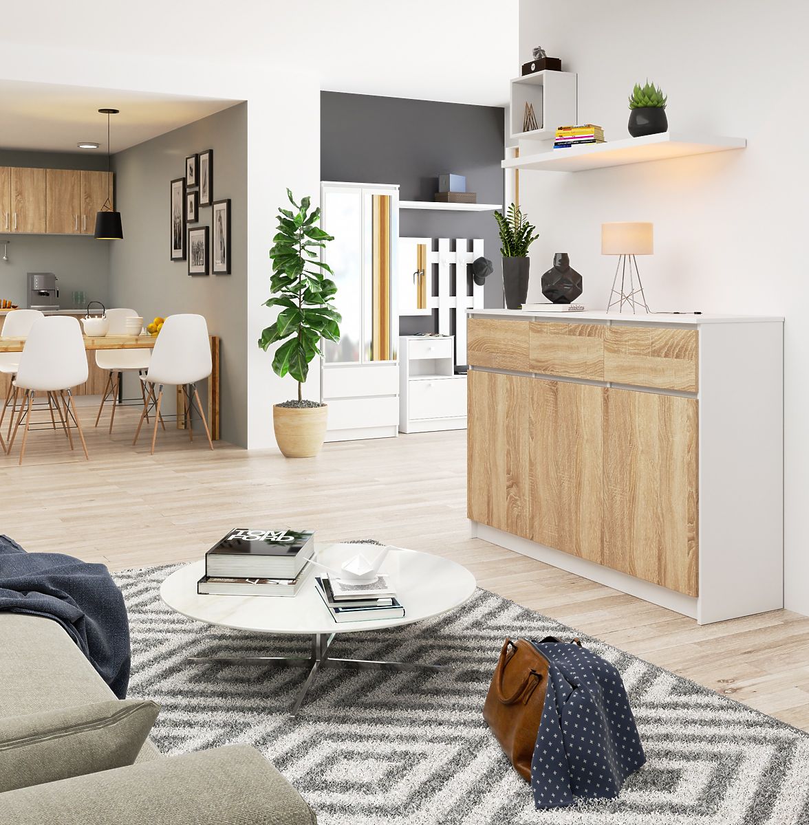 Comodă albă cu fațade Sonoma, 3 sertare și 3 uși. .. mai mult