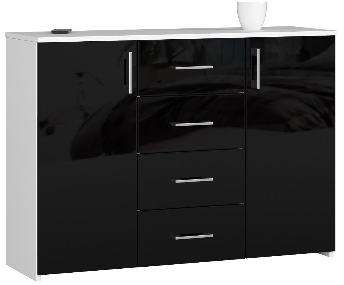 Comodă albă cu fațadă neagră lucioasă și 4 sertare. .. mai mult