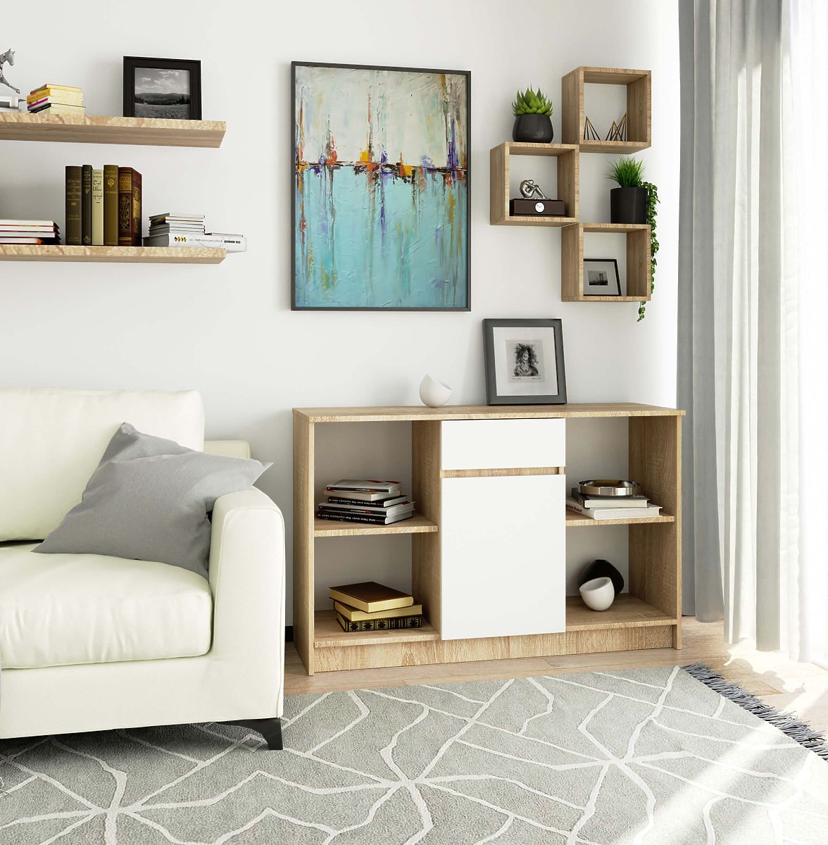 Designul inteligent al comodei B-17 o face potrivită pentru camere precum living, dormitor, hol sau dressing. Combină rafturi deschise cu un dulap închis și un sertar. Sertarul are opțiunea de blocare, ceea ce permite depozitarea obiectelor de valoare. Este un loc excelent pentru a plasa mărunțișuri, suveniruri și diverse decorațiuni. Combinația de alb și lemn deschis o face potrivită pentru aranjamente moderne.