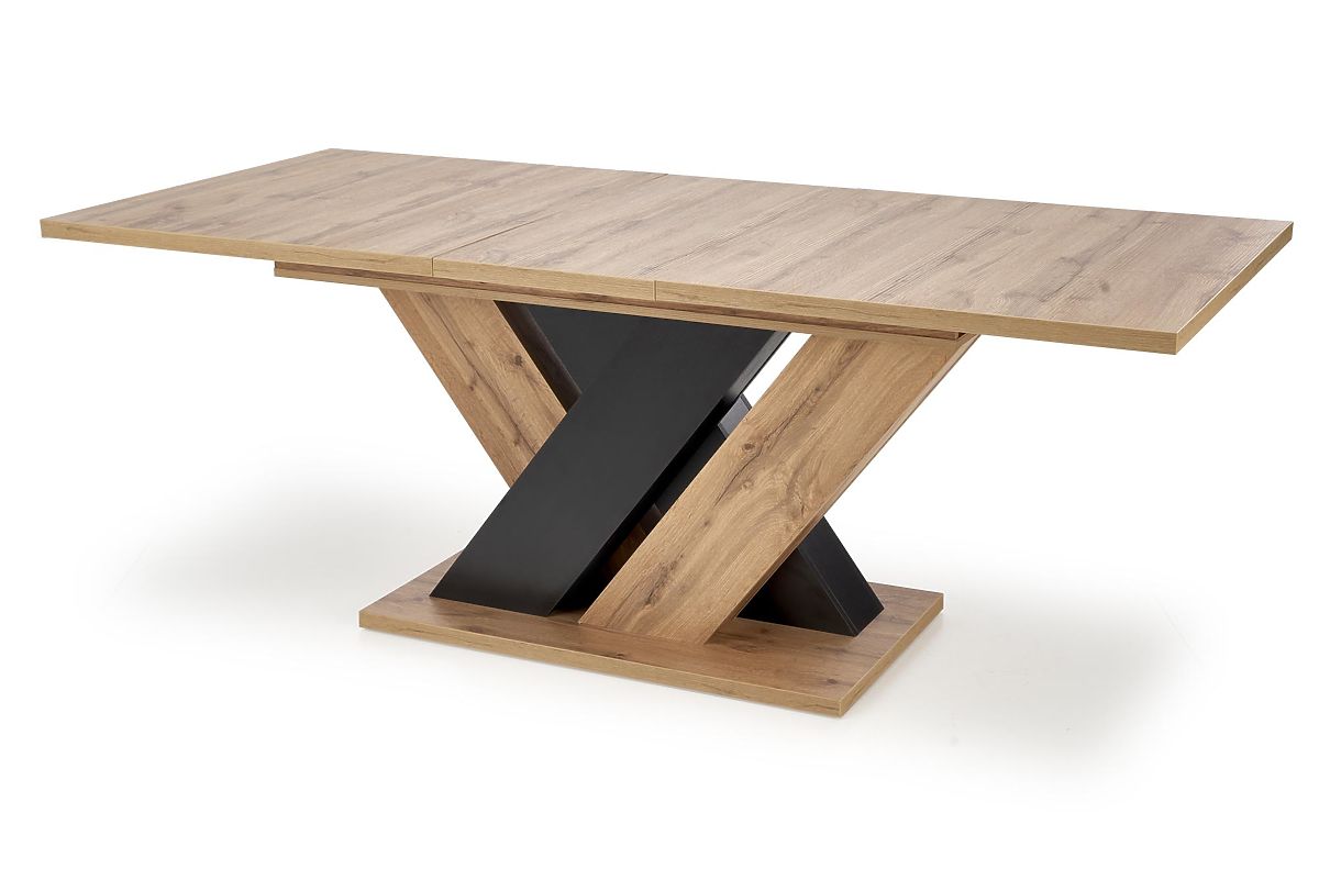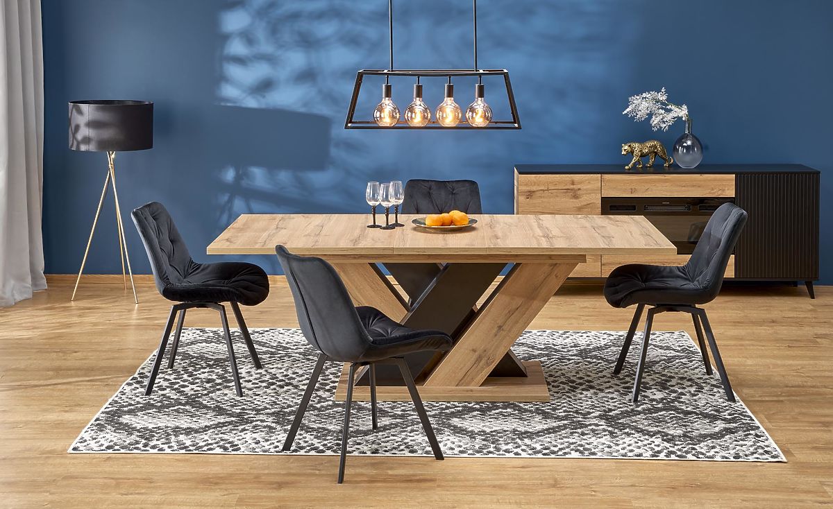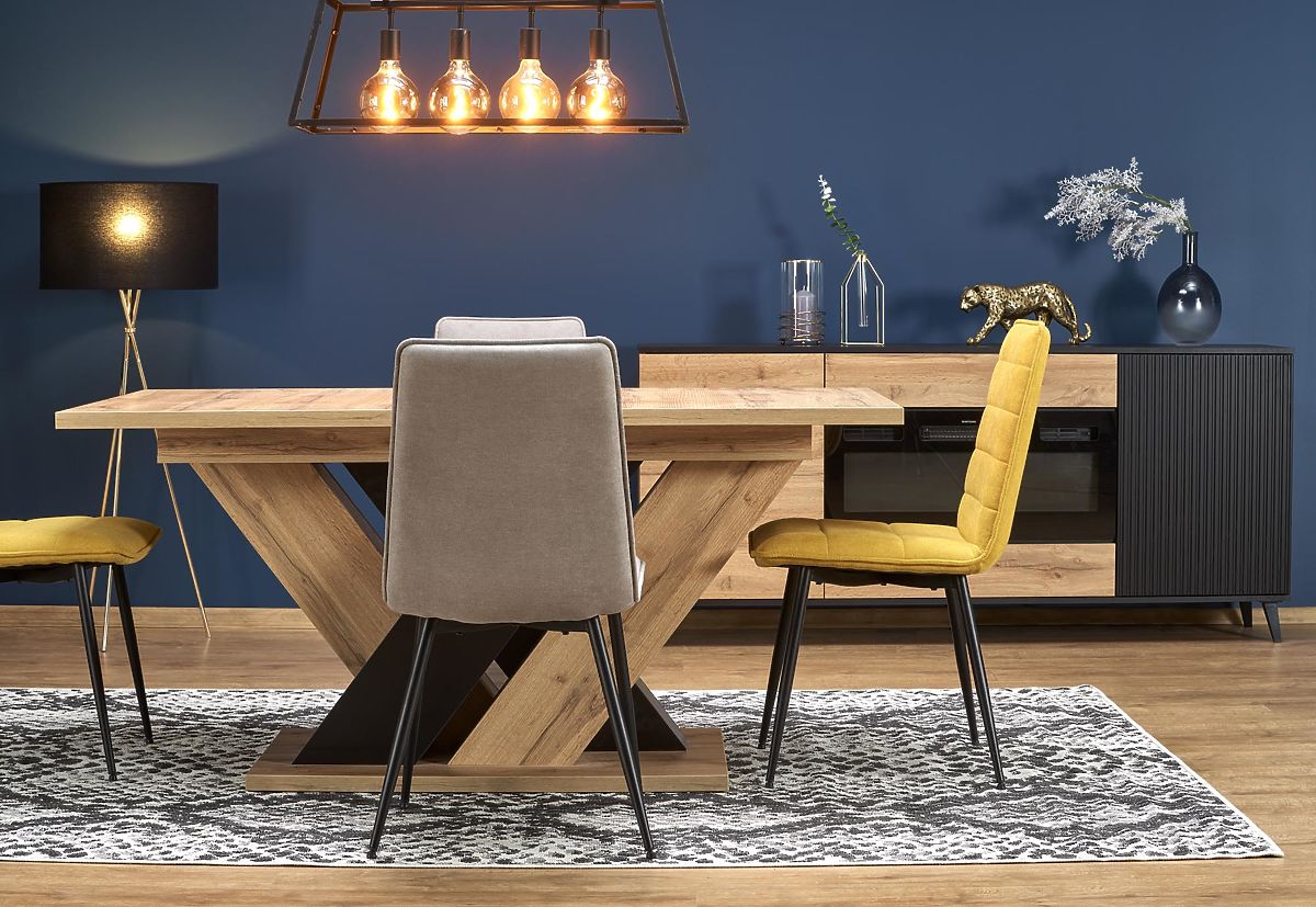 Designul interesant al picioarelor, realizate dintr-o placă în combinație de decoruri stejar wotan și negru, oferă mesei un aspect unic și creează un element distinctiv în interior. Construcția în formă de X asigură, de asemenea, o stabilitate și o rezistență excelentă, astfel încât nu trebuie să vă temeți de balansări sau deplasări nedorite.