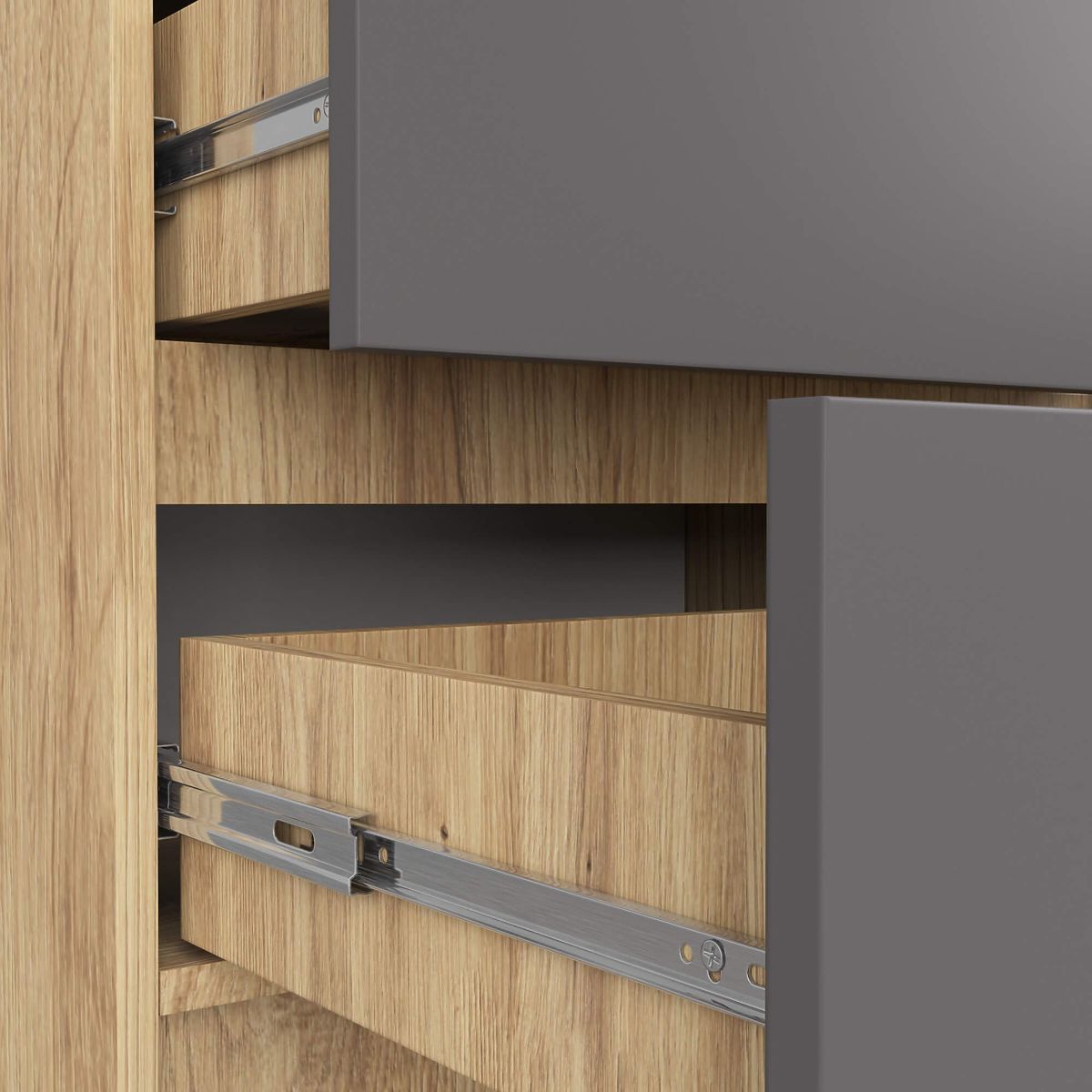 - Sertarele se mișcă pe glisiere metalice cu bile - Marginile sunt acoperite cu bandă ABS care asigură o protecție ridicată împotriva deteriorării
