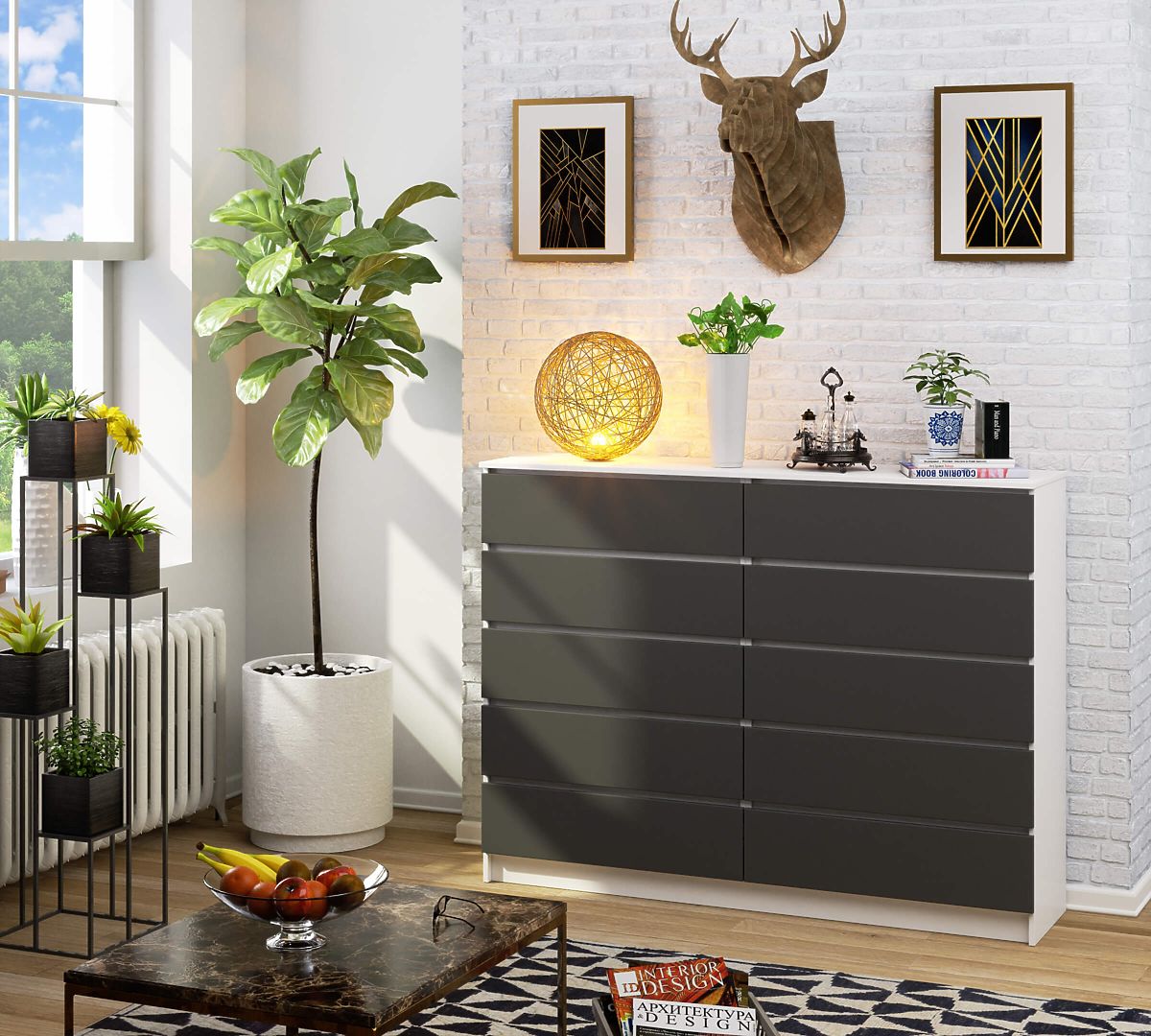 Comodă cu 10 sertare din placă laminată albă și MDF gri grafit. .. mai mult