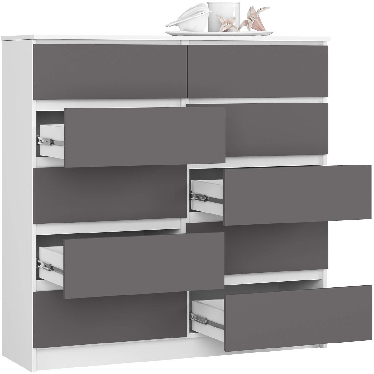 Comodă albă/gri cu 10 sertare și fronturi din placă laminată. .. mai mult