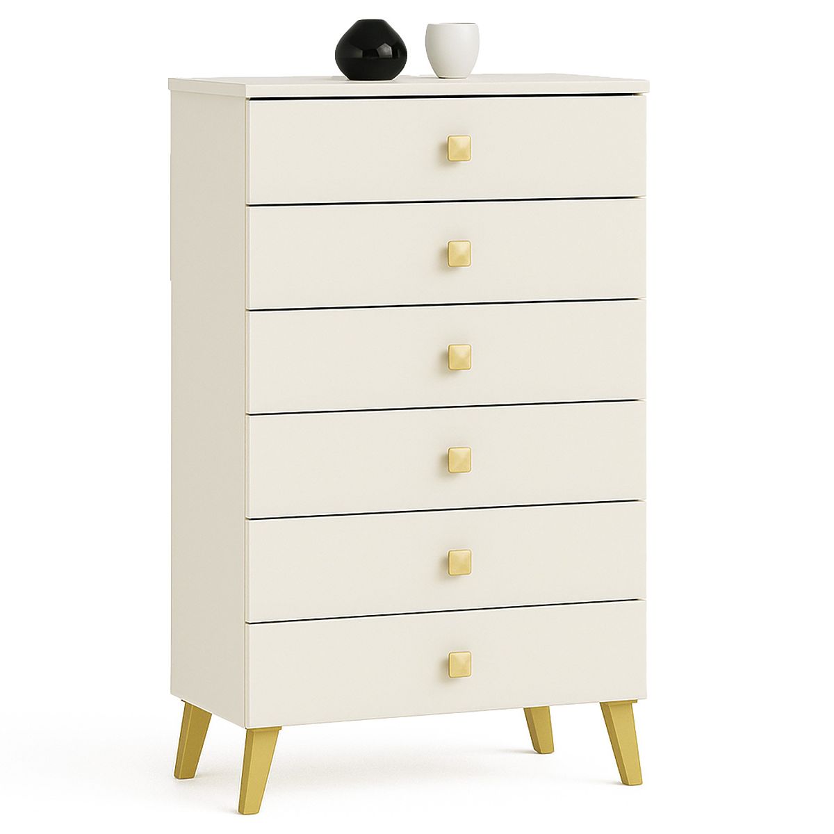 Comoda mică este un element de mobilier care își găsește utilitatea în orice încăpere. Culorile moderne, construcția solidă și finisajul atent au dus la crearea unui dulap care se va dovedi util, de exemplu, în hol, camera de zi sau camera de studiu, dar și în dormitor. Poate fi utilizată și în spațiul de birou, unde va permite stocarea multor documente și alte necesități de birou. Comoda este compusă din 6 sertare. Mobilierul combină culorile cașmir și auriu.