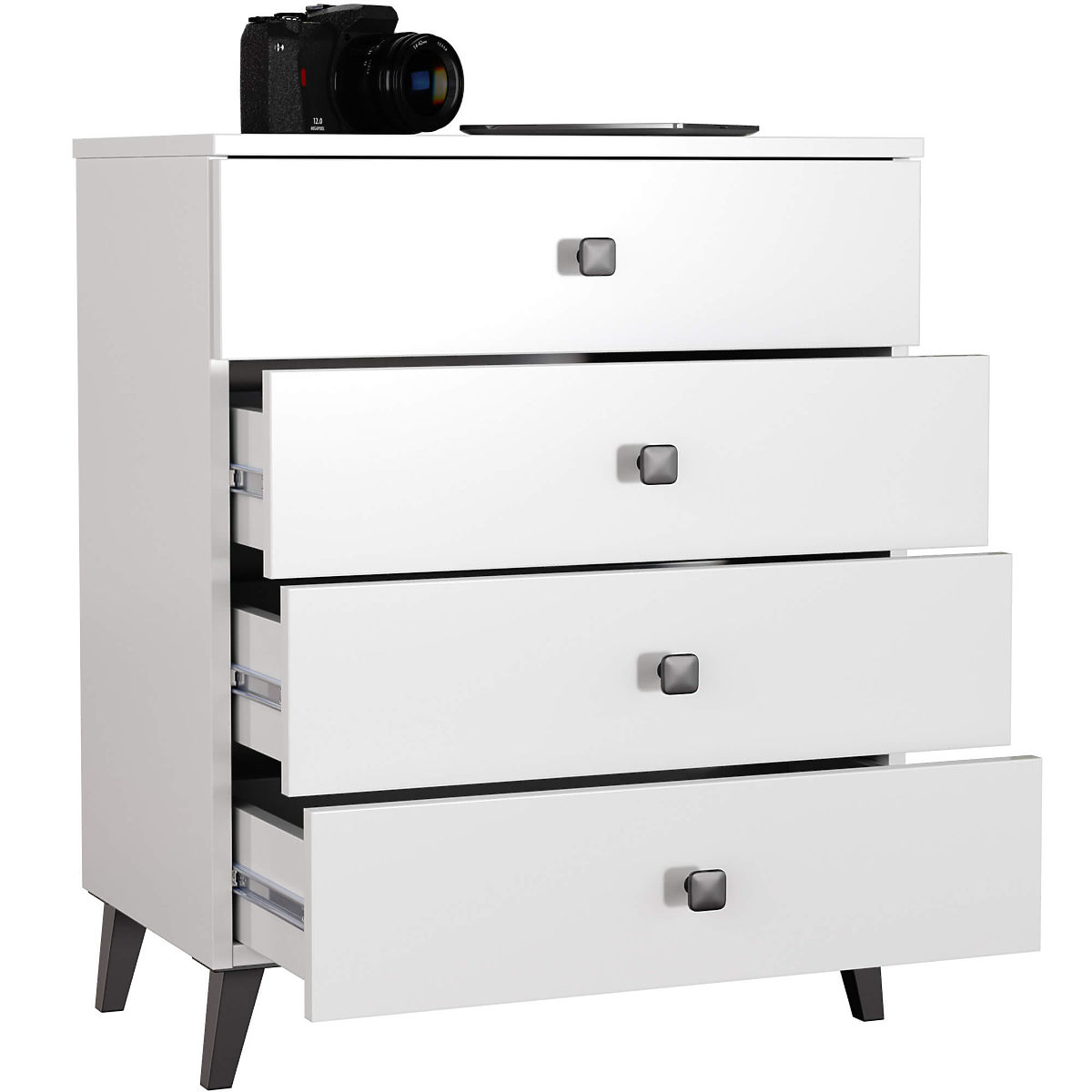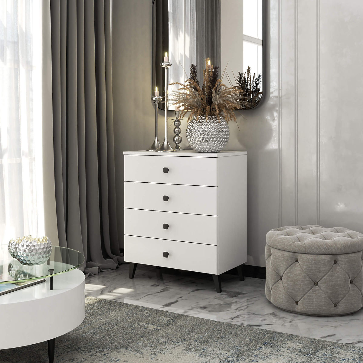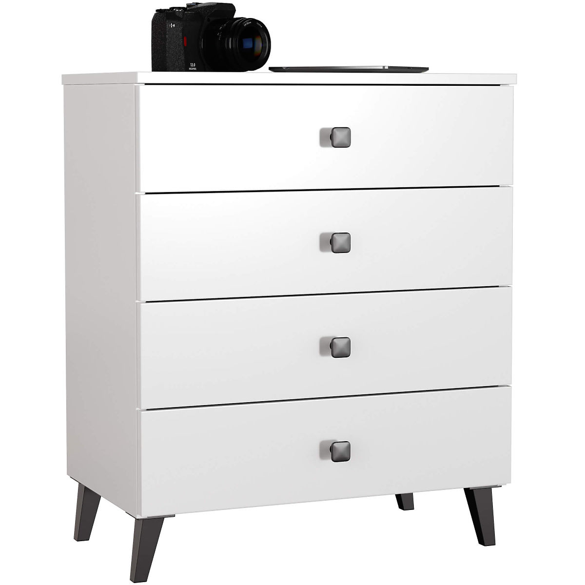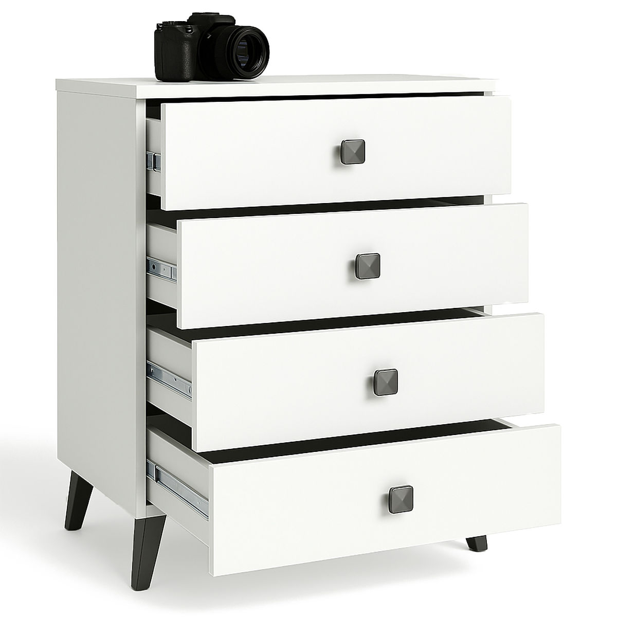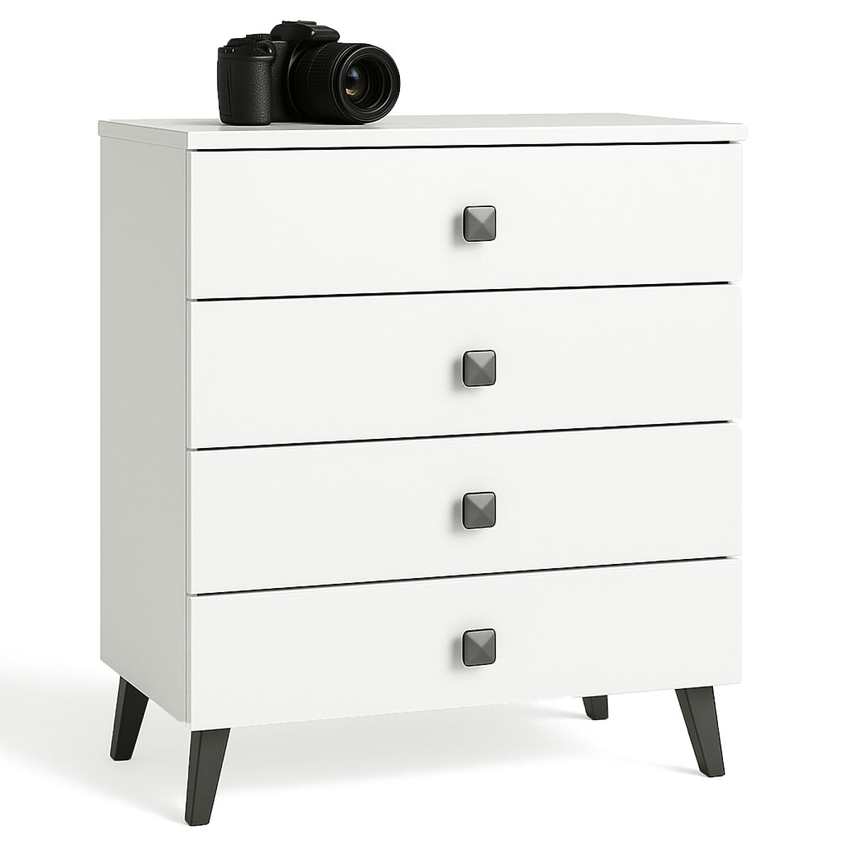 Comoda mică este un element de mobilier care își găsește utilitatea în orice cameră. Culorile moderne, construcția solidă și finisajul atent au dus la crearea unui dulap care se potrivește, de exemplu, în hol, camera de zi sau camera copiilor, dar și în dormitor. Poate fi utilizată și în spații de birouri, unde permite depozitarea numeroaselor documente și alte necesități de birou. Comoda este compusă din 4 sertare. Mobilierul combină culorile alb și negru.