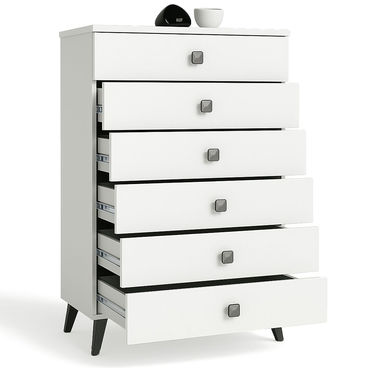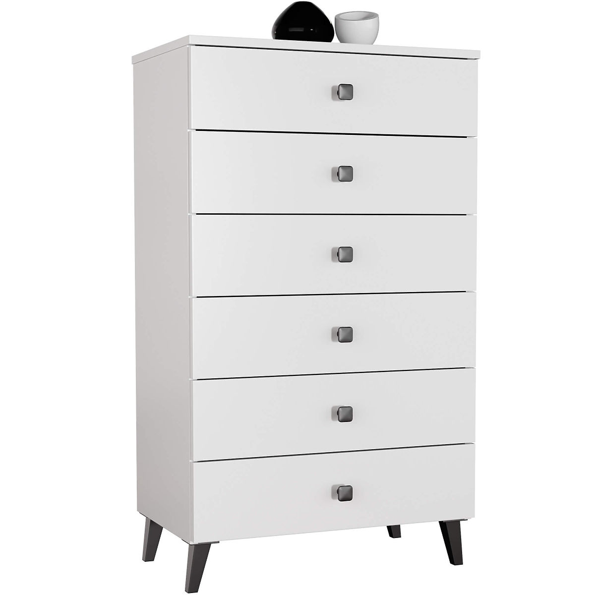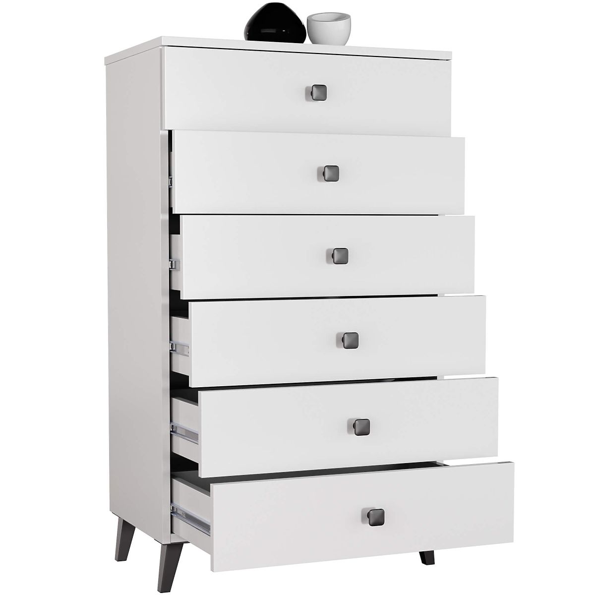 Comoda mică este un element de mobilier care își găsește utilitatea în orice cameră. Culorile moderne, construcția solidă și prelucrarea atentă au dus la crearea unui dulap care se va dovedi util, de exemplu, în hol, camera de zi sau camera copilului, dar și în dormitor. Poate fi folosită și în spațiul de birou, unde permite depozitarea multor documente și alte necesități de birou. Comoda este compusă din 6 sertare. Mobilierul combină culorile alb și negru.