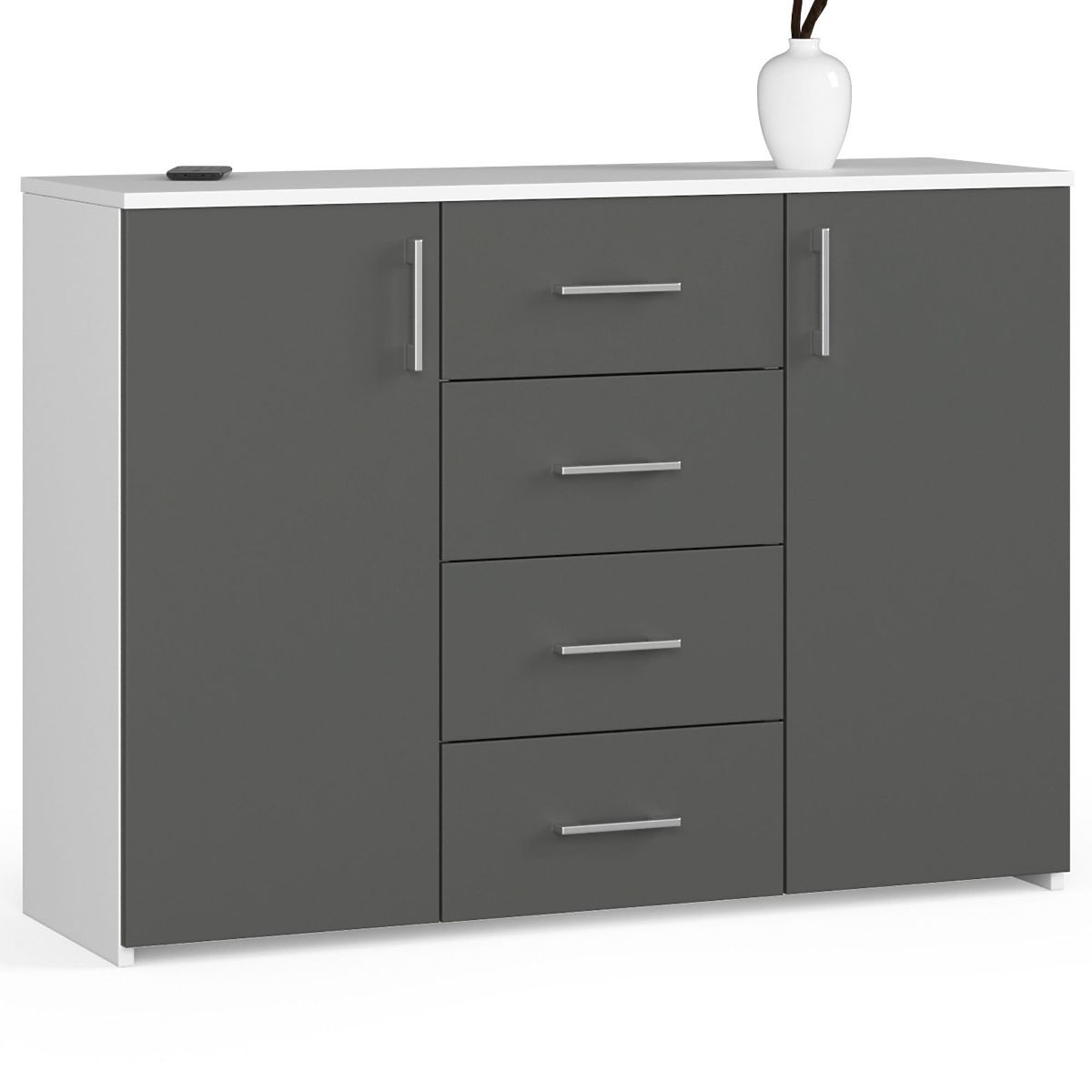Comoda albă / gri grafit este un mobilier mare și spațios cu multe funcții utile. Pe ambele părți ale comodei sunt uși, în spatele cărora se află 4 rafturi adânci. Centrul mobilierului este de asemenea foarte funcțional proiectat, deoarece este echipat cu 4 sertare adânci. Comoda oferă astfel mult spațiu de depozitare.