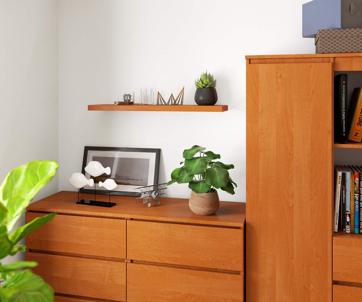 Fabricat din placă laminată rezistentă la uzură. Marginile sunt acoperite cu melamină. Pachetul include suporturi de perete invizibile.