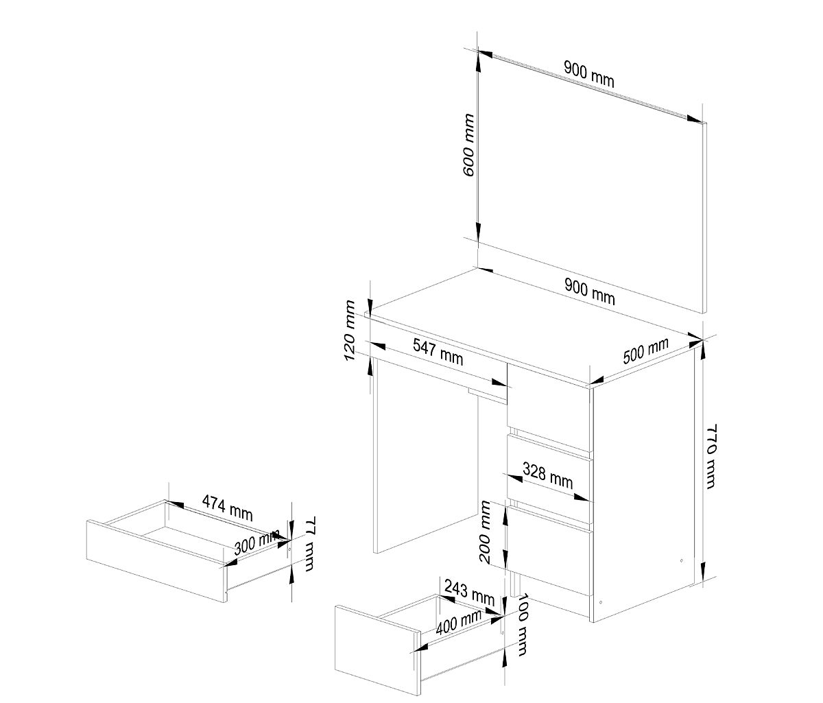 Masă de toaletă albă cu oglindă pentru machiaj, cu codul T-6/SL 900x600 din sistemul CLP.