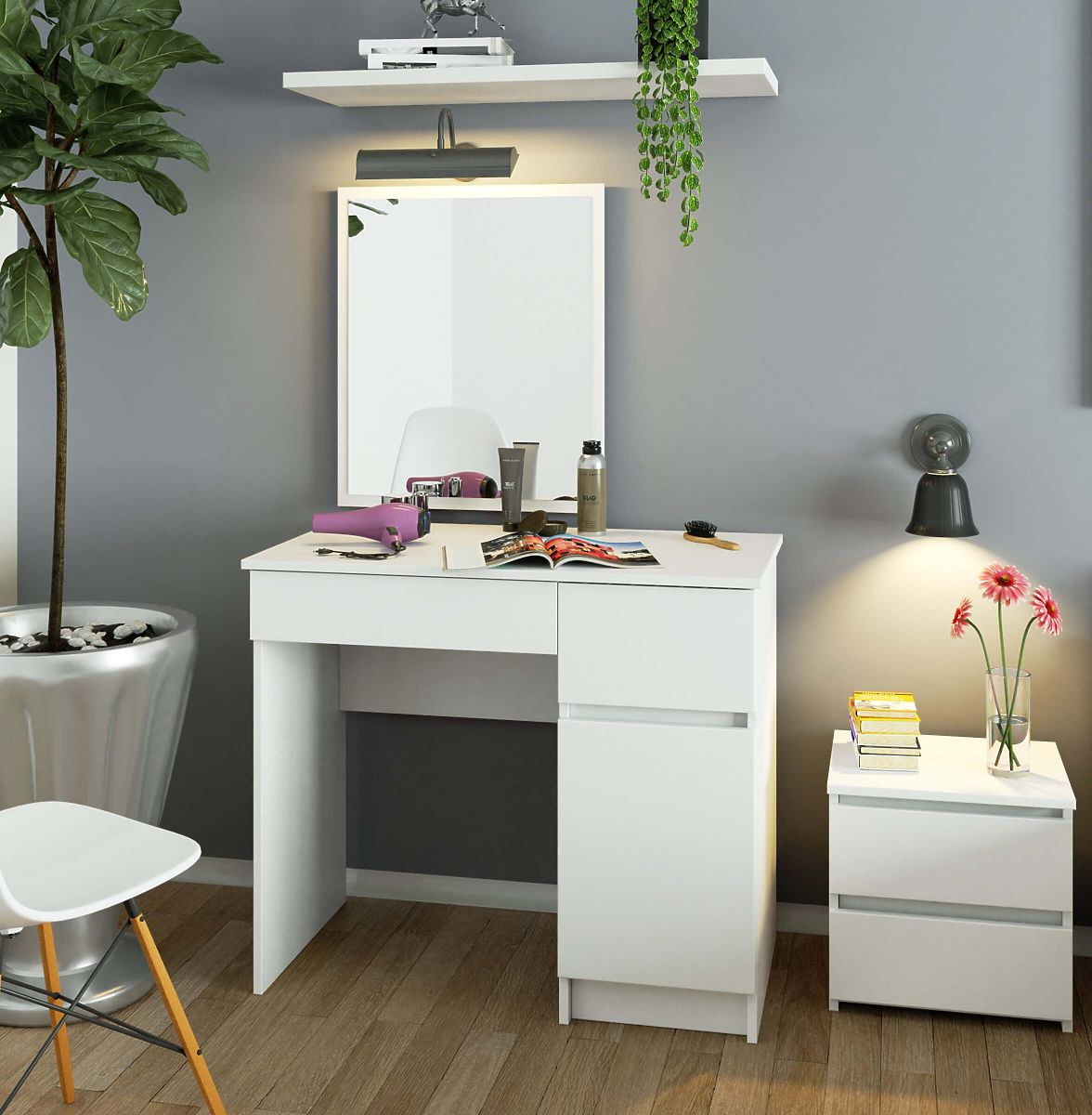 Versiune compactă a mesei de toaletă pentru femeile care doresc să aibă posibilitatea unui machiaj rapid în fiecare dimineață. O soluție destinată dormitorului și nu numai. Dimensiunile mesei de toaletă sunt potrivite și pentru saloanele de cosmetică.