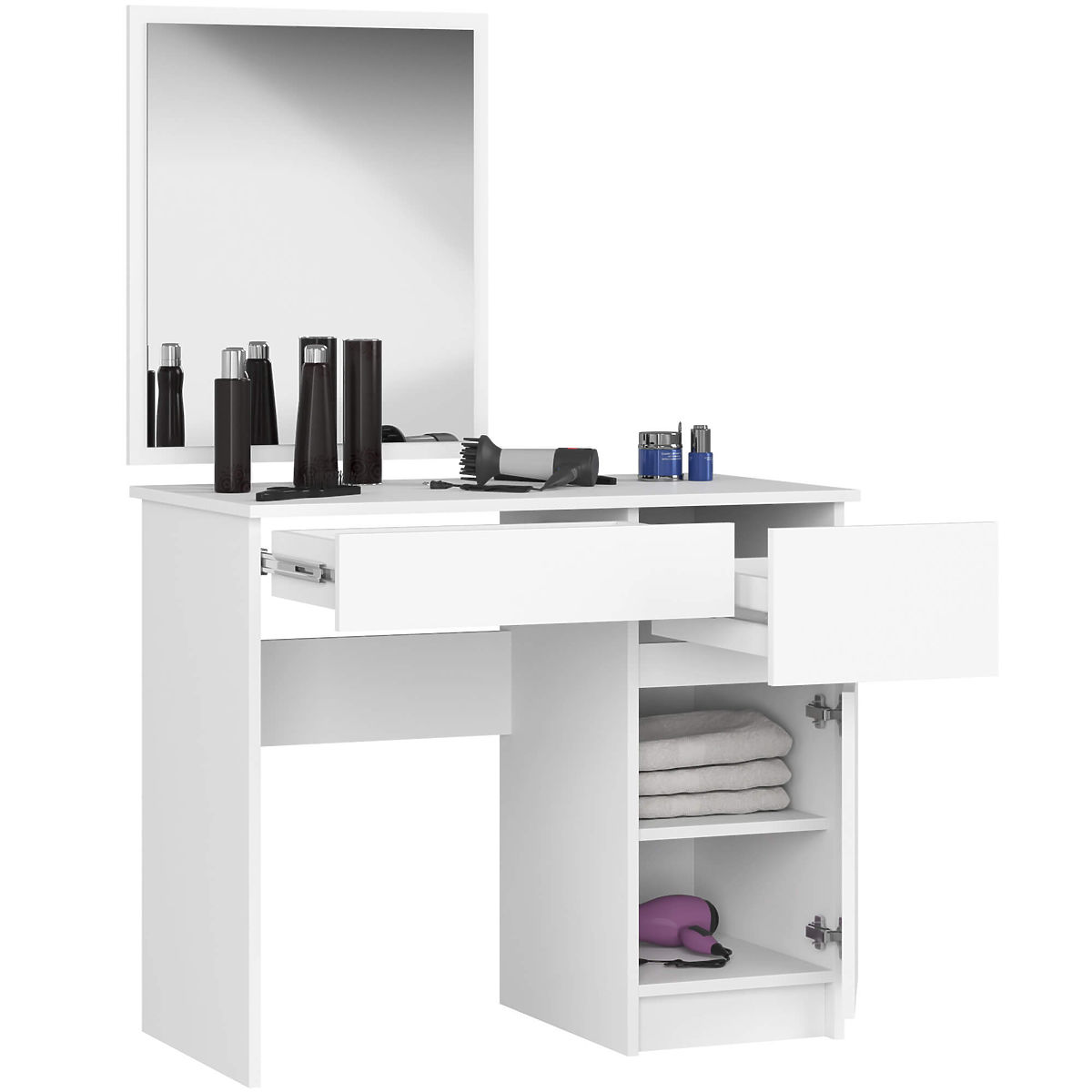 Masă de toaletă cu oglindă în nuanță albă, cu sertare și spațiu generos în spatele ușilor. 240