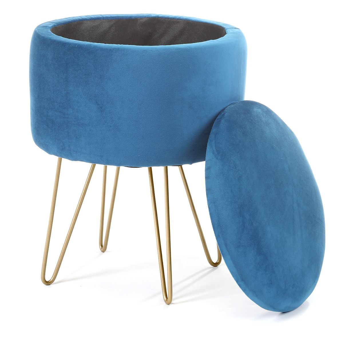 Puf albastru cu spațiu de depozitare și picioare aurii. .. mai mult