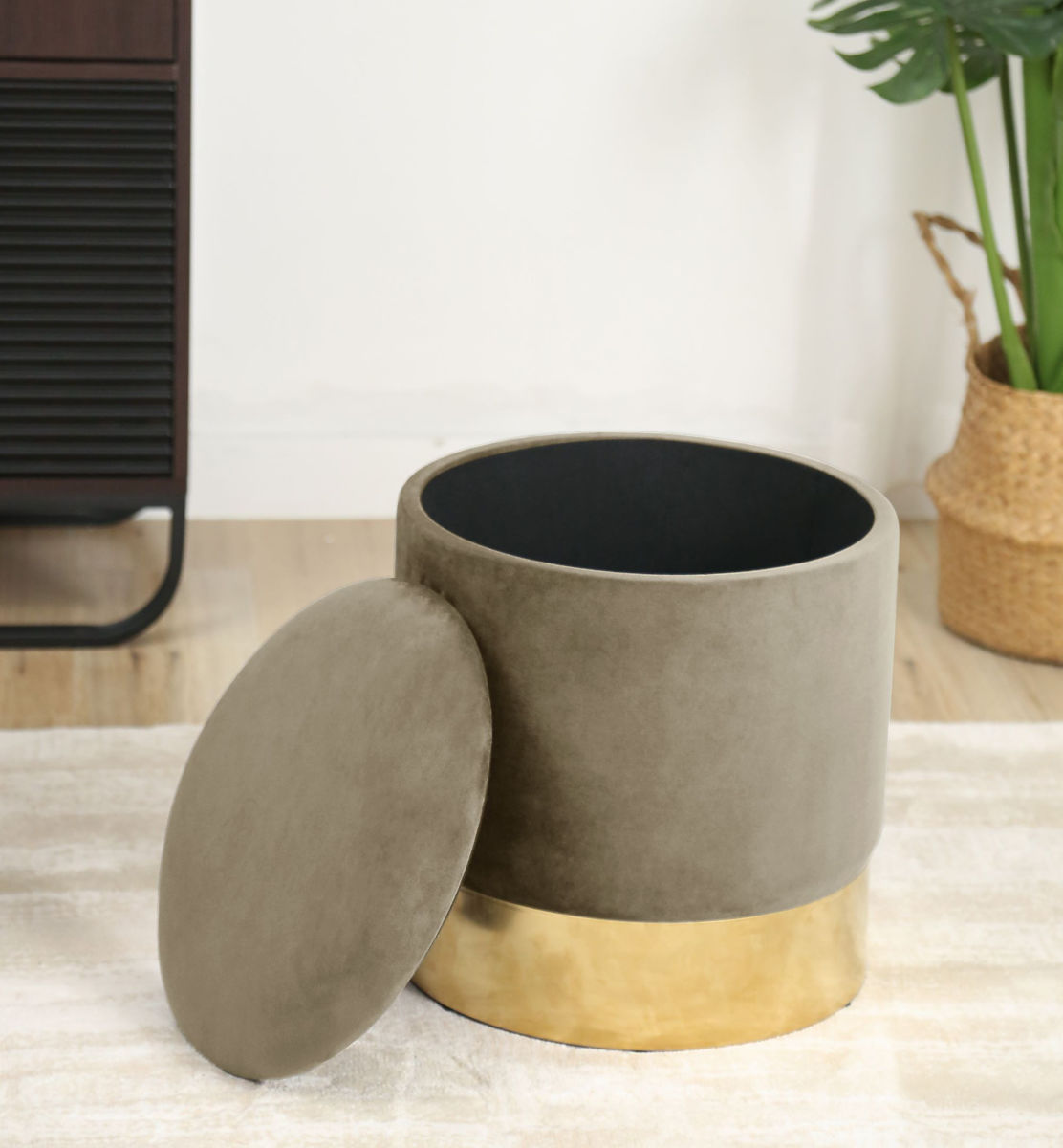 Puf rotund bej cu spațiu de depozitare și bază aurie. .. mai mult
