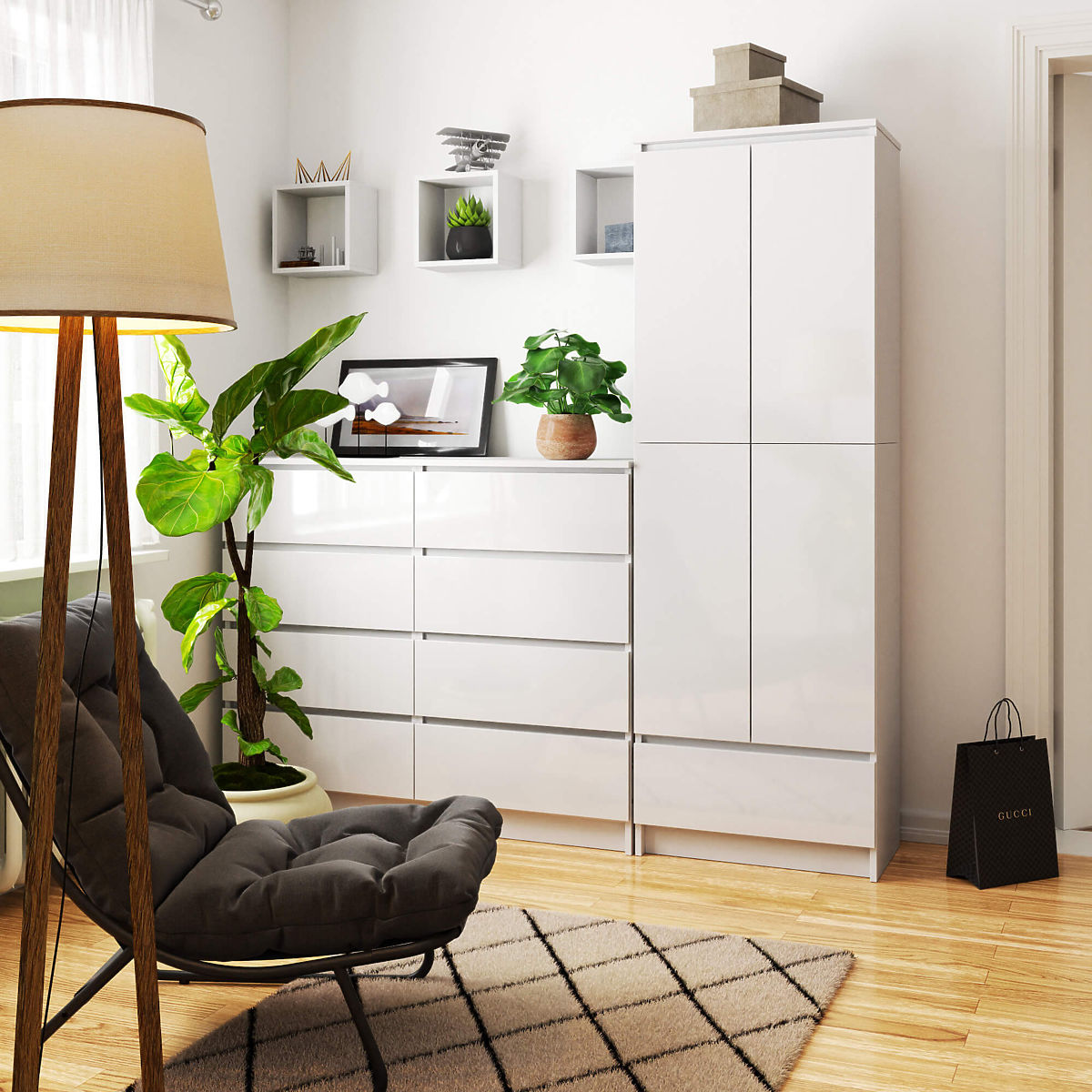 Biblioteca albă de birou cu sertar este o combinație perfectă de funcționalitate și atracție vizuală. Mobilierul este practic și ușor de întreținut în curățenie perfectă, fiind în același timp foarte eficient. În partea închisă se află rafturi spațioase, în timp ce în partea de jos se află un sertar spațios și ușor de glisat. Utilizarea bibliotecii este foarte versatilă și depinde de nevoile individuale. În dulap pot fi depozitate cărți, dosare cu documente și rechizite de birou, la fel de bine poate fi folosită pentru veselă, fețe de masă sau prosoape. Culoarea alb clasic și forma simplă a bibliotecii asigură că mobilierul se potrivește în orice interior, indiferent de culoarea pereților sau de stilul în care este amenajat. Mobilierul este fabricat dintr-un material durabil, care este o placă laminată rezistentă la uzură și deteriorare. Marginile dulapului sunt acoperite cu un cant ABS durabil și estetic. Fațadele bibliotecii sunt lăcuite cu un luciu înalt, ceea ce conferă mobilierului un plus de eleganță. Ușile superioare și inferioare sunt unite într-un singur ansamblu și nu sunt deschise separat.