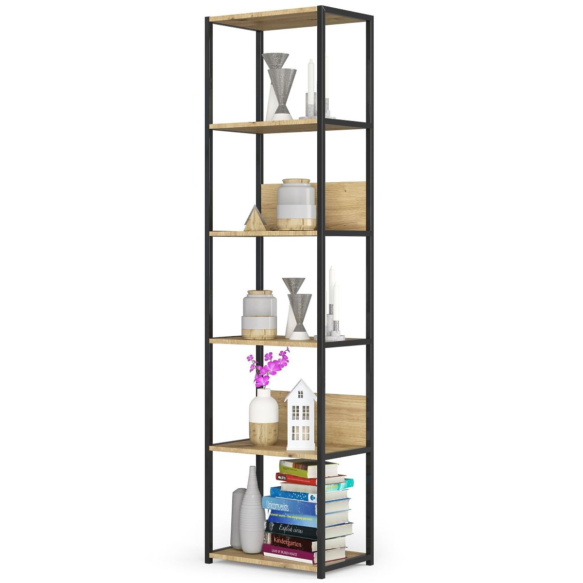 Raftul metalic loft este un mobilier practic și modern, potrivit atât pentru sufragerie, cât și pentru birou. Raftul are un cadru metalic negru și 6 rafturi în culoarea Stejar Artisan. Rafturile sunt fabricate din placă laminată cu o grosime de 16 mm. Este un material durabil și solid, care se remarcă prin rezistența sa ridicată la abraziune. Marginile sunt suplimentar protejate cu bandă ABS, astfel încât mobilierul să arate bine chiar și în cazul utilizării zilnice intense. Raftul este echipat cu 6 rafturi, pe care puteți plasa obiecte pe care doriți să le expuneți sau să le aveți la îndemână. În ansamblu, are un aspect foarte stilat și modern.