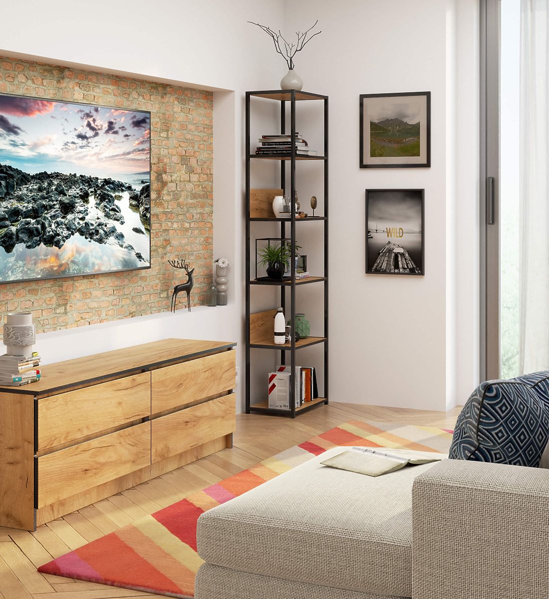 Adâncime - 32 cmRaftul metalic industrial este un mobilier practic și modern, potrivit atât pentru living, cât și pentru birou. Cadrul este de culoare neagră. Polițele raftului sunt fabricate din placă laminată de 16 mm în culoarea stejar craft. Este un material durabil și rezistent, caracterizat printr-o rezistență ridicată la abraziune. Marginile sunt, de asemenea, protejate cu bandă ABS, asigurând un aspect bun al mobilierului chiar și în cazul utilizării zilnice intense. Aspectul general este foarte modern.
