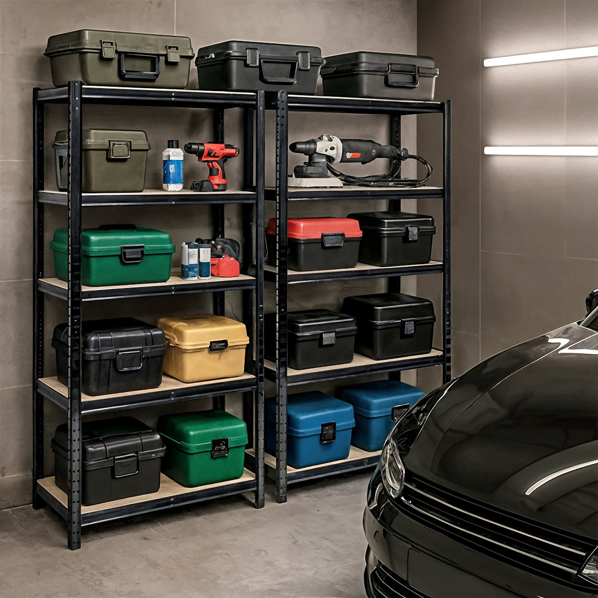 Raft metalic negru cu 5 polițe, capacitate 175 kg pe poliță. .. mai mult