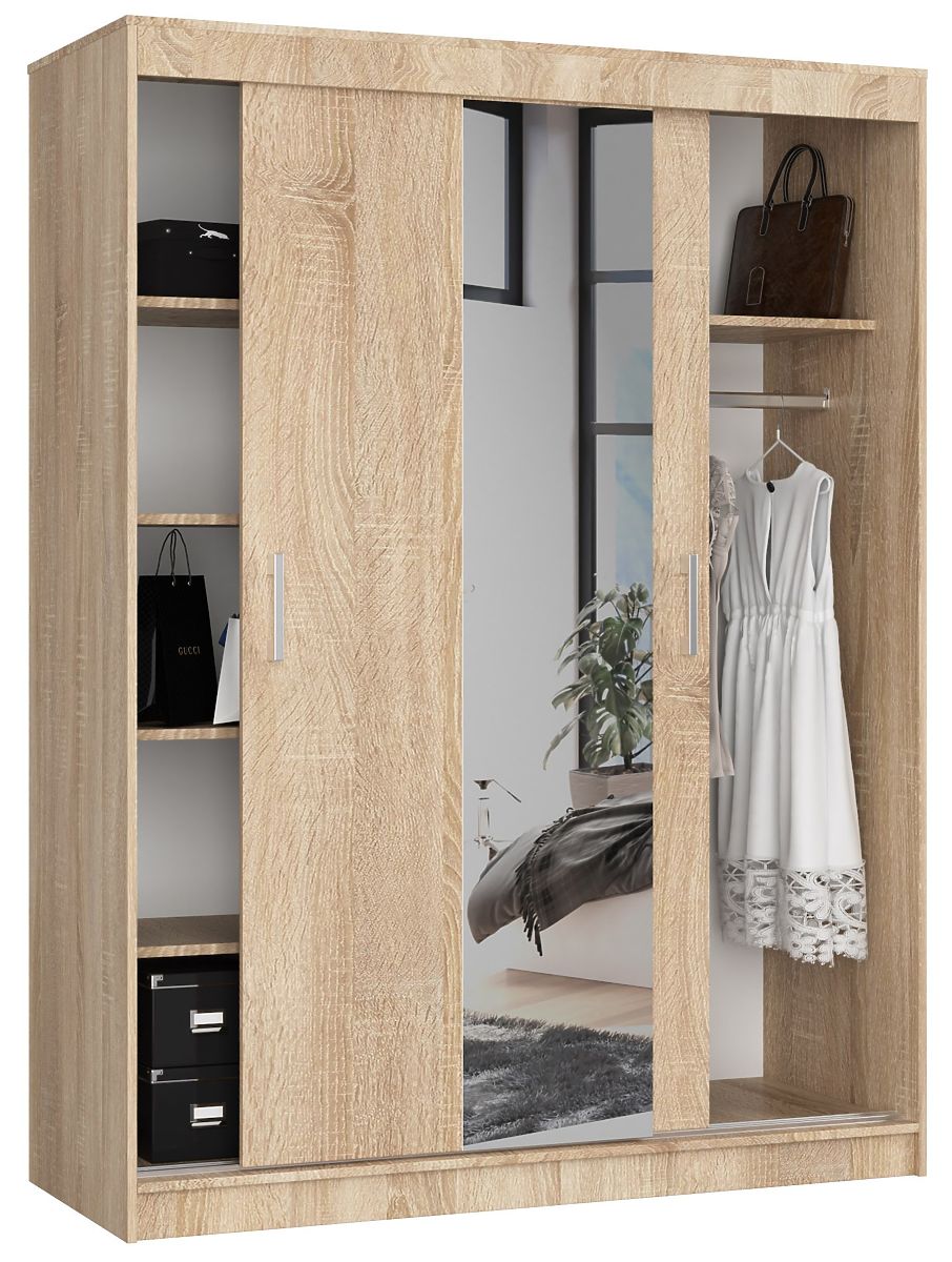 Dulapul cu uși glisante și oglindă amplasată în partea centrală a mobilierului este fabricat din placă laminată Kronospan de înaltă calitate, rezistentă la abraziune. Atât corpul mobilierului, cât și parțial fiecare dintre cele 2 uși care se mișcă pe ghidaje metalice, sunt menținute în nuanța caldă a stejarului sonoma. Interiorul dulapului este funcțional împărțit în 2 părți. În partea stângă sunt amplasate, una deasupra celeilalte, polițe spațioase (5 bucăți). Partea dreaptă a dulapului este destinată agățării hainelor. În aceasta este instalată o poliță superioară, sub care este fixată o bară metalică.