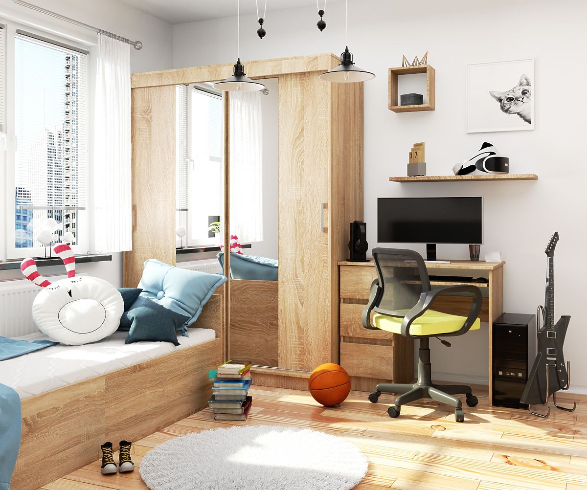 Dulapul spațios în culoarea stejarului sonoma, cu uși glisante și oglindă, este un mobilier universal și atemporal, care își va îndeplini funcția în aproape orice cameră de locuit. Se potrivește perfect în camera copiilor și adolescenților, precum și în dormitor sau dressing. Într-un hol de dimensiuni potrivite, poate servi ca dulap pentru hainele exterioare și alte necesități esențiale în casă.