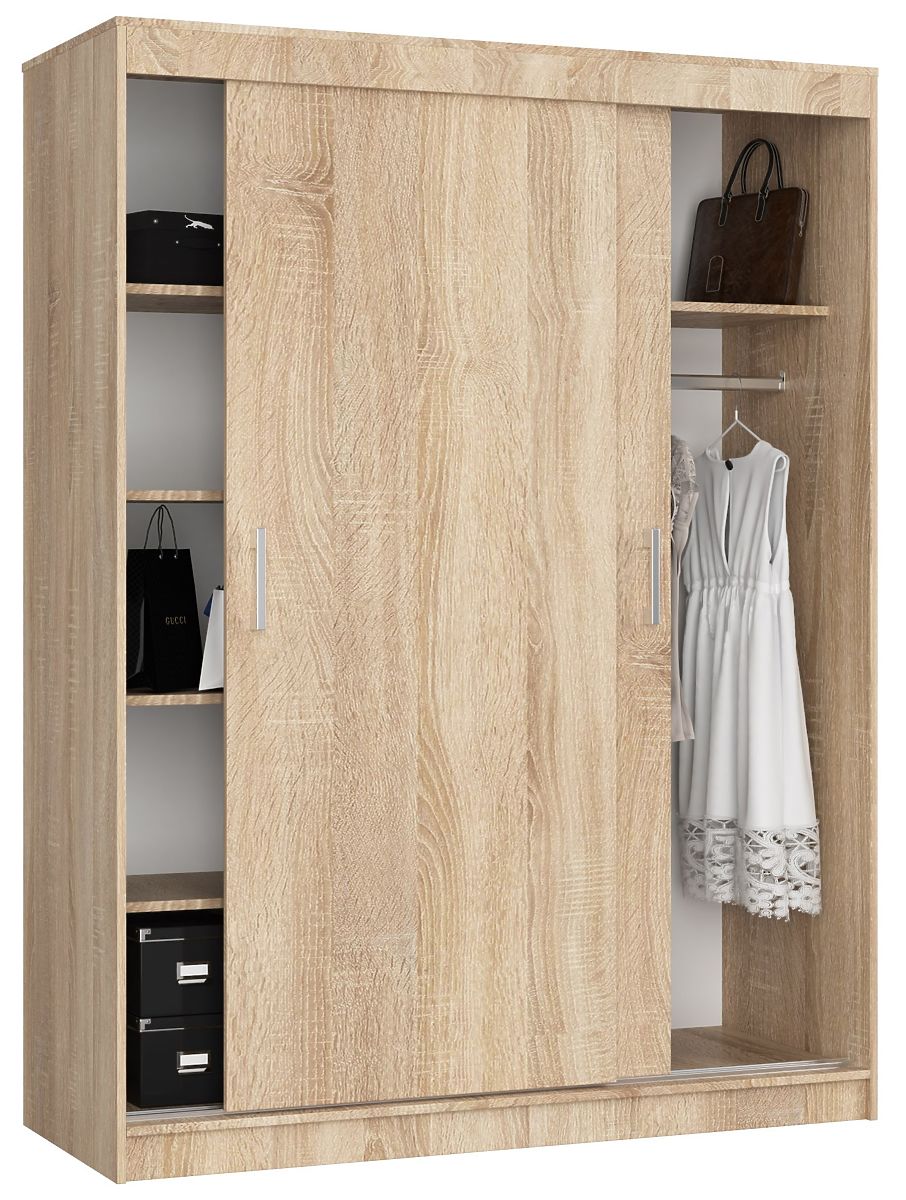 Când achiziționăm un dulap, ne ghidăm după criteriul de a fi practic și de a putea depozita cât mai multe haine și accesorii. Aceste condiții sunt cu siguranță îndeplinite de dulapul nostru glisant CLP cu o înălțime de 200 cm și o lățime de 150 cm! Datorită celor 6 rafturi adânci și barei, veți putea depozita fără probleme nu doar tricouri obișnuite, ci și rochii elegante, costume sau sacouri. Ce altceva caracterizează dulapul nostru? Realizarea în culoarea stejar sonoma se potrivește ideal în interioare simple, minimaliste, scandinave. Cu siguranță se va potrivi bine și cu pereții albi.