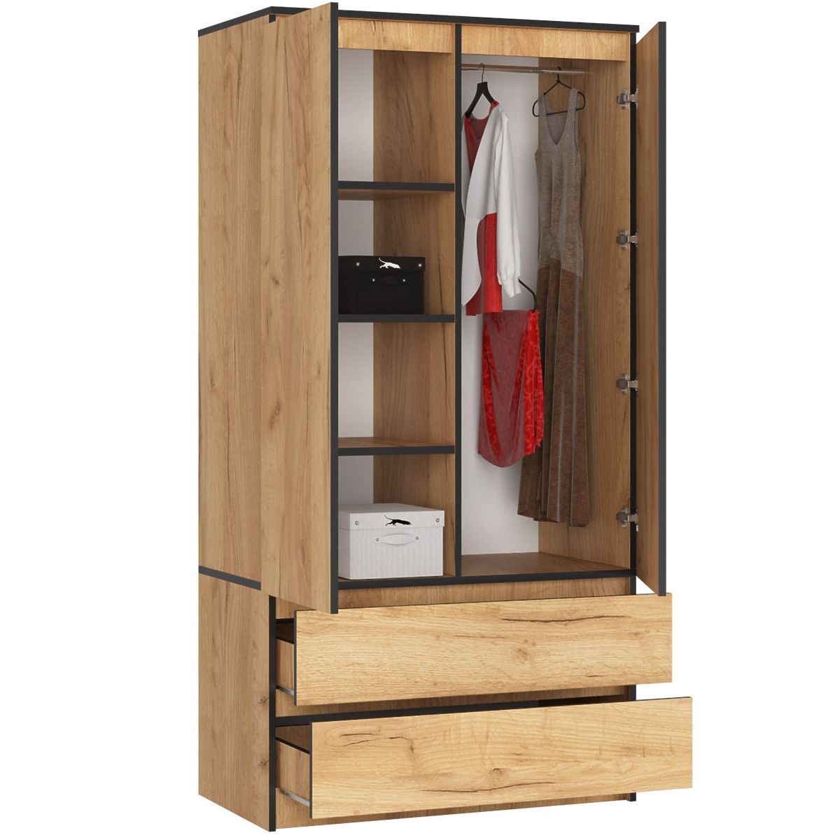 Dulapul cu două uși este fabricat din placă laminată rezistentă. Corpul mobilierului este complet în culoarea stejar craft. Partea inferioară a dulapului este formată din două sertare așezate paralel unul peste altul, în timp ce segmentul superior, mai înalt, este împărțit în două părți. Partea stângă conține un set de 4 rafturi, în timp ce partea dreaptă, echipată cu o bară, este destinată agățării hainelor.