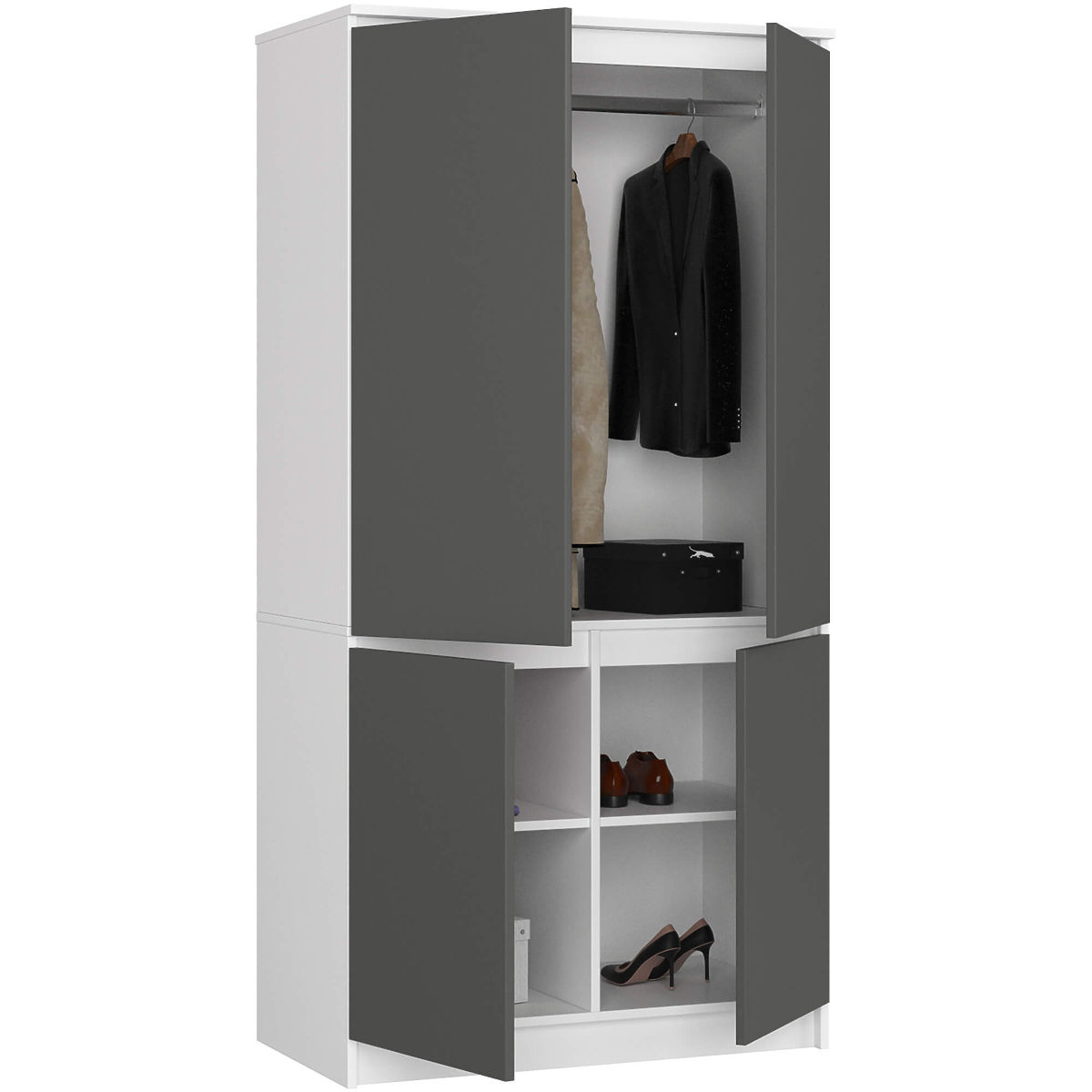 Dulapul cu patru uși este o piesă de mobilier universală și practică, care completează perfect dormitorul, holul sau camera de zi în interioarele de tip studio. Designul elegant și combinația de culori alb gri grafit fac ca dulapul să se potrivească ideal atât în aranjamente clasice, cât și moderne. Dulapul este echipat cu rafturi spațioase, ideale pentru depozitarea articolelor de îmbrăcăminte sau a huselor de rezervă pentru pături și perne, cearșafuri, fețe de masă sau pături. În partea mobilierului situată în spatele ușilor rabatabile se află o bară pentru umerașe. Rafturile pot fi folosite pentru pulovere, bluze, genți, dar și pentru prosoape. În schimb, bara este utilă pentru agățarea costumelor, rochiilor, fustelor și hainelor exterioare, cum ar fi paltoanele sau jachetele. Mobilierul se remarcă printr-o execuție atentă din placă laminată de cea mai bună calitate, rezistentă la abraziune. Marginile dulapului au fost finisate cu o bandă estetică ABS.