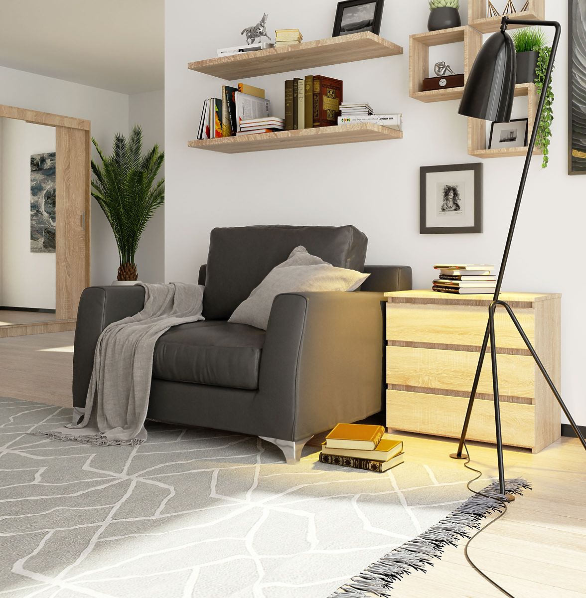 Comodă modernă cu trei sertare în culoarea stejar sonoma. .. mai mult