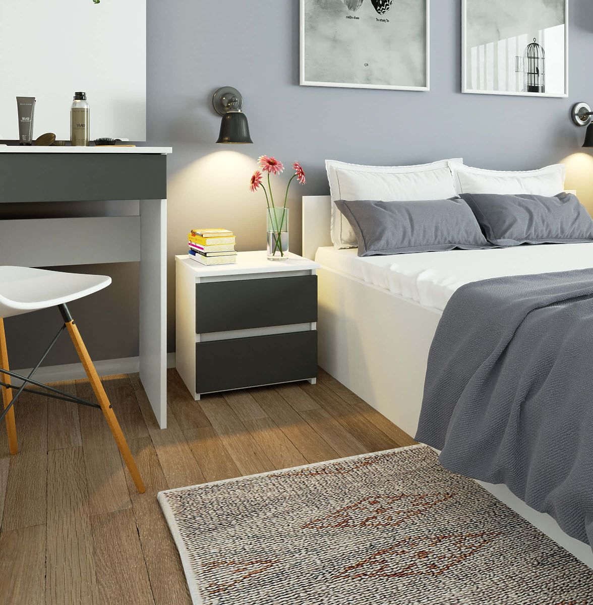 Noptierele sunt un tip popular de mobilier care se plasează lângă pat. Pe suprafața sa se poate așeza o lampă, în timp ce în sertare - obiecte importante care îmbunătățesc calitatea odihnei și somnului. În oferta noastră este disponibilă o noptieră albă CL2 de 40 cm cu fronturi de sertare în culoare grafit gri. Are un aspect elegant și modern, fiind în același timp funcțională. Se potrivește perfect în orice dormitor sau cameră de tineret.