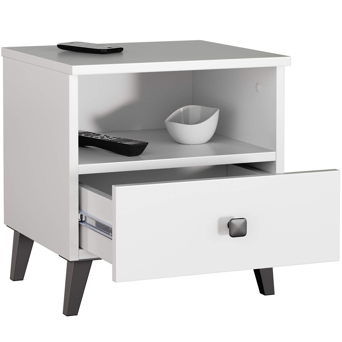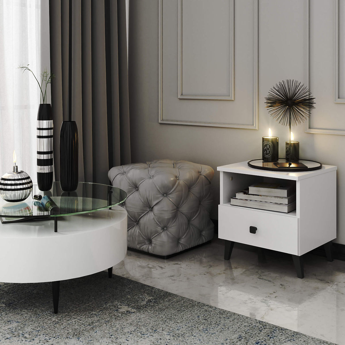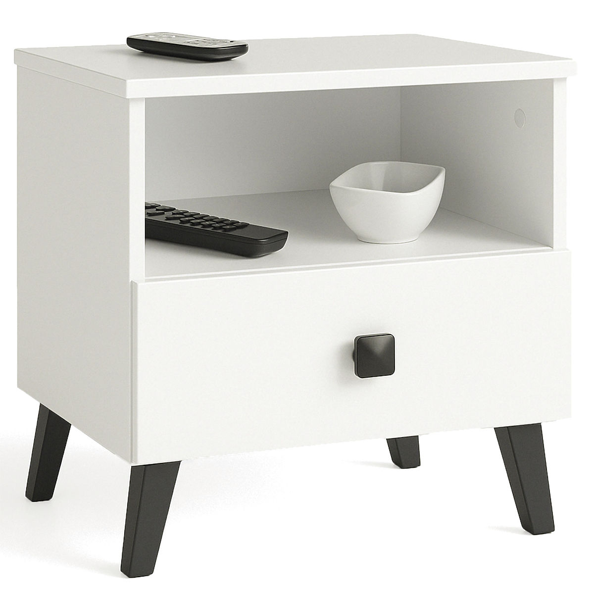 Noptiera MOBI K01 albă și neagră, cu sertar și nișă. .. mai mult