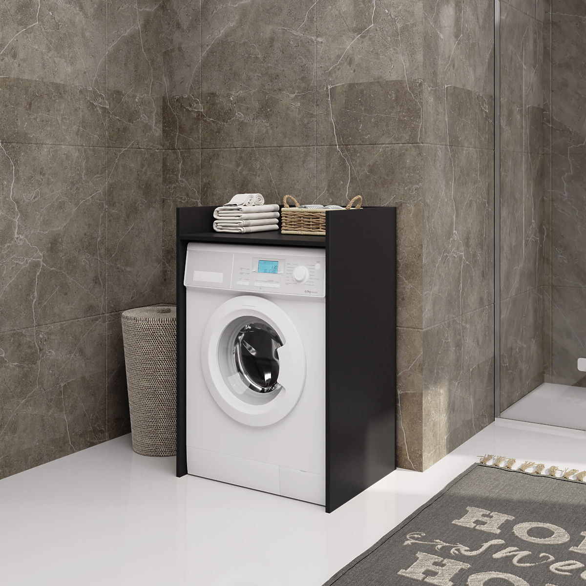 Dulap negru deasupra mașinii de spălat, economisind spațiu în baie. .. mai mult