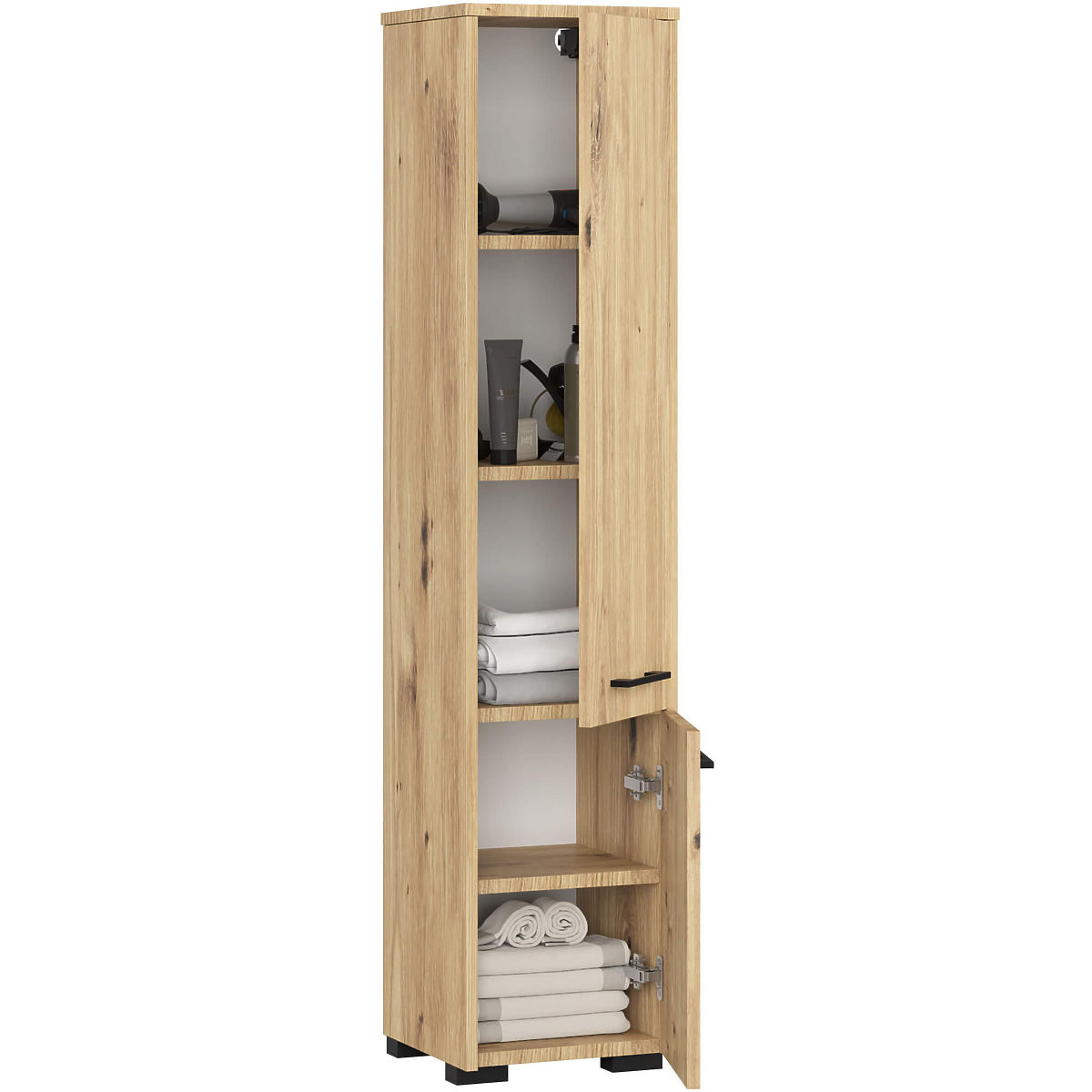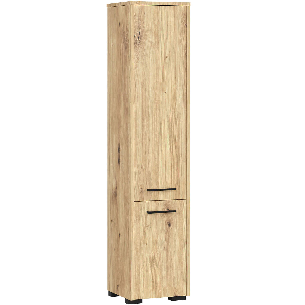 Dulapul de baie Fin 2 uși este o piesă de mobilier universală, care poate fi utilizată în orice baie, indiferent de dimensiunea acesteia. Designul elegant și culoarea stejar artisan asigură că dulapul se potrivește perfect cu orice stil de baie, fie cu echipamente clasice sau moderne, și de asemenea cu plăci și faianță în diferite nuanțe. Datorită dimensiunilor sale, dulapul de baie poate umple spațiul adesea neutilizat din colțul băii, precum și poate fi plasat lângă chiuvetă, mașina de spălat sau cabina de duș. Dulapul de baie Fin se remarcă printr-o execuție foarte atentă. Are două uși confortabile și largi cu mânere ergonomice, care asigură accesul facil la interiorul mobilierului. Rafturile adânci și spațioase sunt ideale pentru depozitarea prosoapelor, produselor de toaletă, cosmeticelor sau produselor de curățenie. Dulapul de baie este fabricat din placă laminată rezistentă la abraziune și la acțiunea apei. Marginile ABS, cu care este finisat dulapul, sunt durabile, nu se decolorează și protejează suplimentar dulapul împotriva deteriorării.