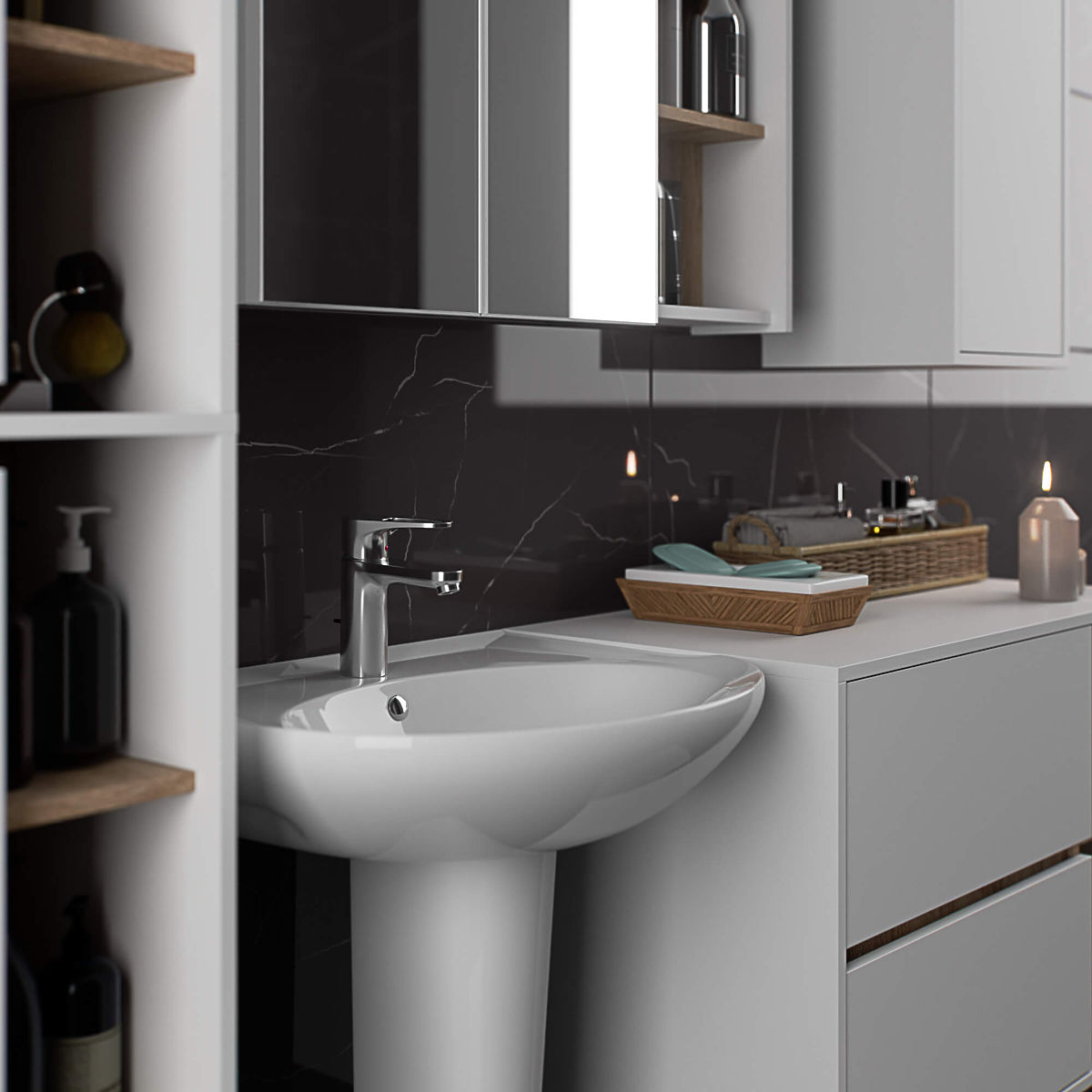 Dulapurile de baie completează perfect echipamentul băii, oferind spațiul necesar pentru toate cosmeticele și detergenții și conferind băii un stil specific. Dulapurile spațioase facilitează menținerea ordinii în încăpere, ceea ce influențează pozitiv estetica interiorului. Colecția VAMI se remarcă printr-o cromatică stilată care atrage atenția - corpul și fronturile au aceeași culoare, în timp ce culoarea interioară este diferită.