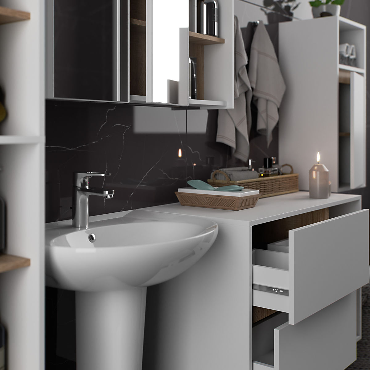 Setul de mobilier de baie VAMI este esența stilului modern. Datorită rafturilor deschise, dulapurile sunt vizual ușoare și se potrivesc perfect cu cele mai noi tendințe de design. Mobilierul de baie VAMI oferă, de asemenea, suficient spațiu închis pentru depozitarea produselor de curățenie, accesoriilor de baie și cosmeticelor. Setul include un dulap suspendat sub chiuvetă cu blat, 2 sertare și 2 rafturi deschise (W90), un dulap suspendat cu 1 raft deschis W35, un dulap suspendat înalt W50 cu 6 rafturi deschise și un dulap suspendat cu oglindă și 3 rafturi deschise W90. Întregul set este uniform în culoare și stil, asigurând un aspect armonios. Dulapul de sub chiuvetă are sertare modelate care permit instalarea sifonului și a elementelor hidraulice. Setul conține: