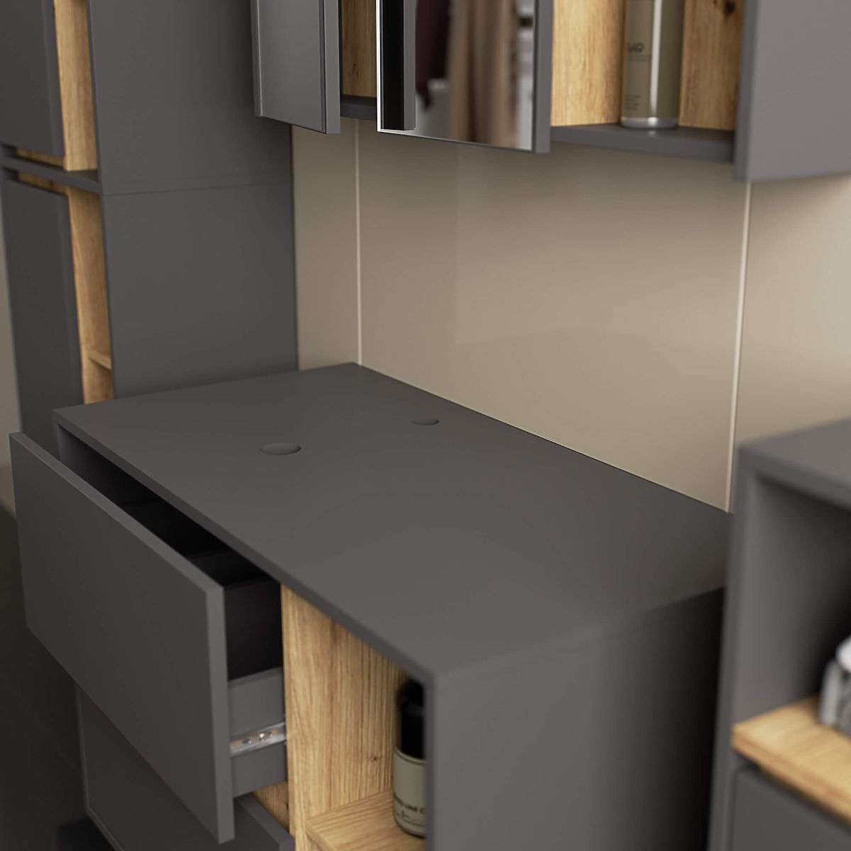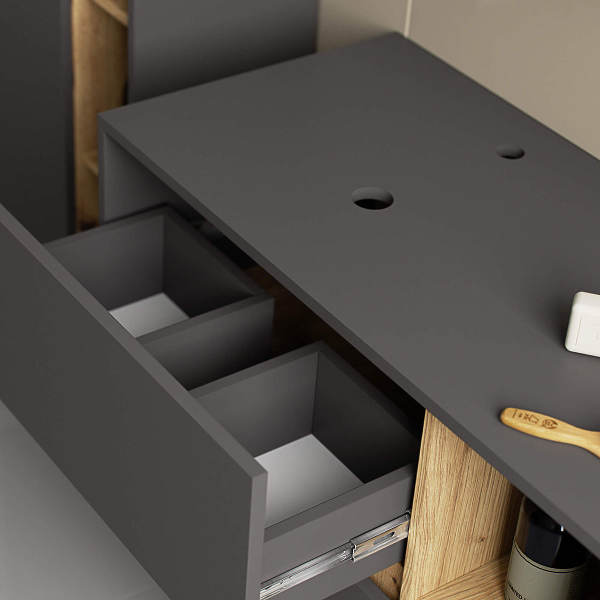 Dulap suspendat pentru baie sub lavoar 90 cm VAMI W90 se potrivește perfect cu un interior modern. Configurația cu 2 sertare și 2 rafturi deschise oferă un mare confort în utilizare. În sertarele spațioase pot fi depozitate produse de igienă și cosmetice, iar pe rafturile deschise pot fi plasate, de exemplu, decorațiuni care adaugă un caracter personal interiorului. Modelul descris de dulap suspendat sub lavoar are 2 orificii în placă destinate montării lavoarului și sifonului. Dulapul are, de asemenea, sertare special formate care permit instalarea sifonului și a elementelor hidraulice. ATENȚIE! Mobilierul este livrat fără lavoar și armături.