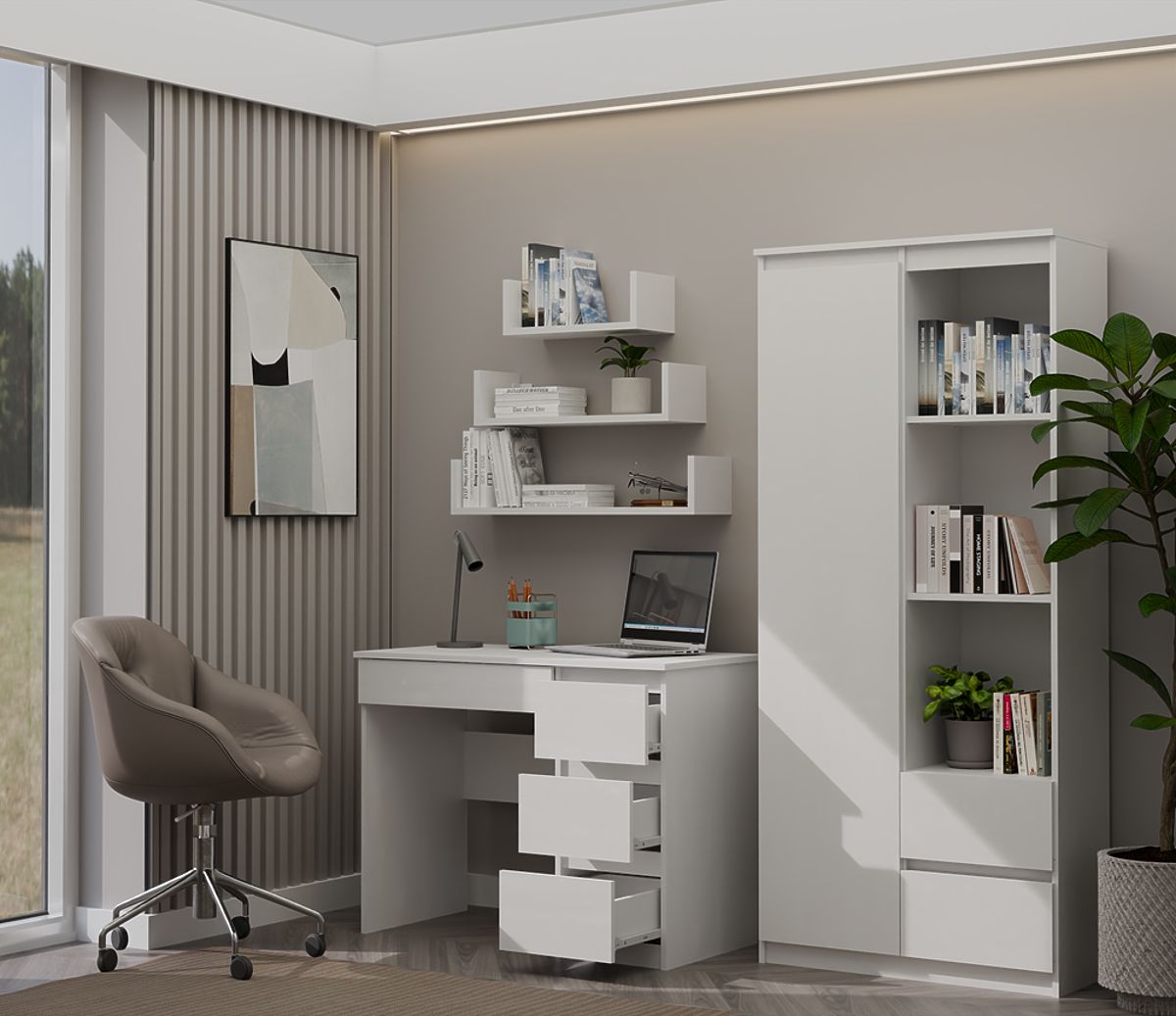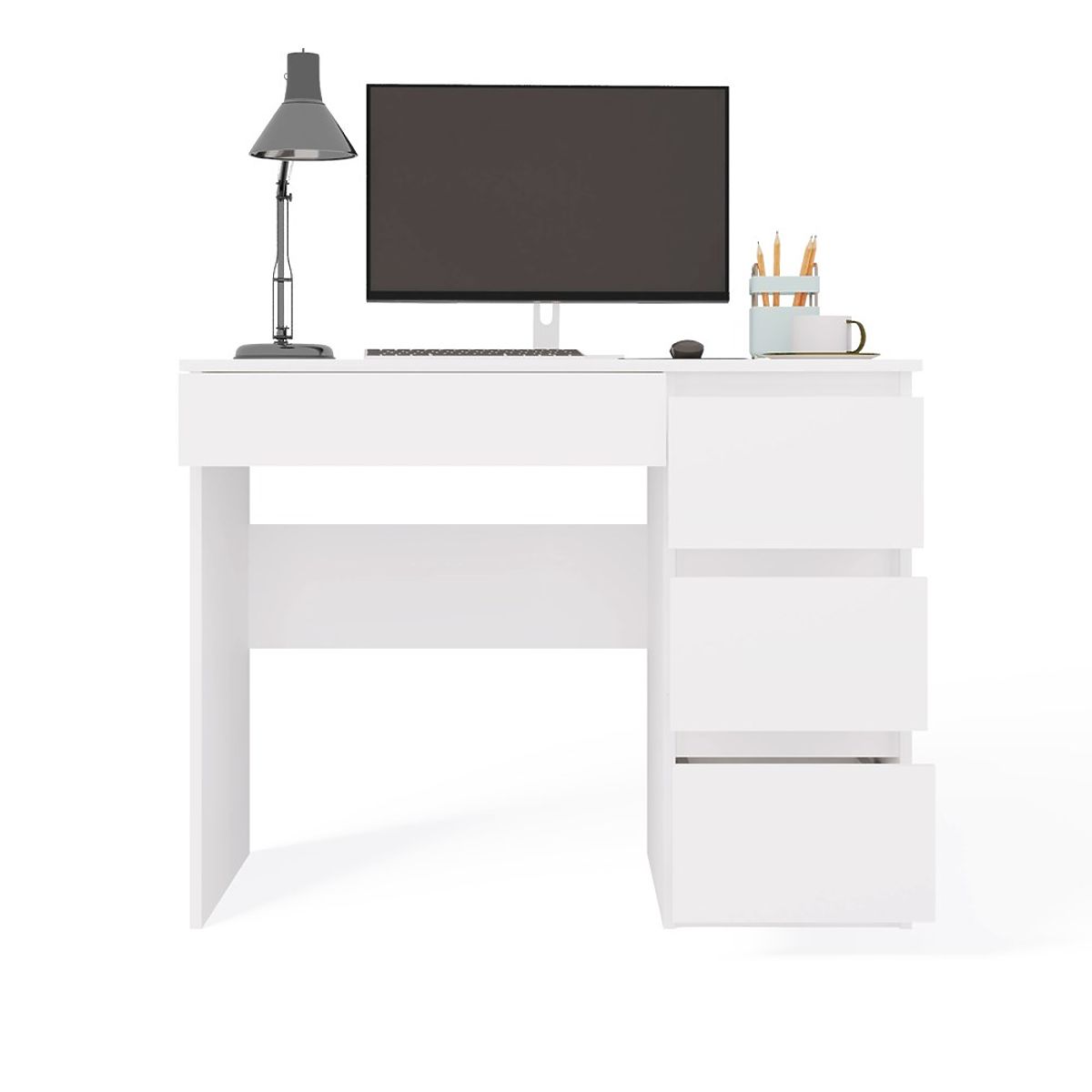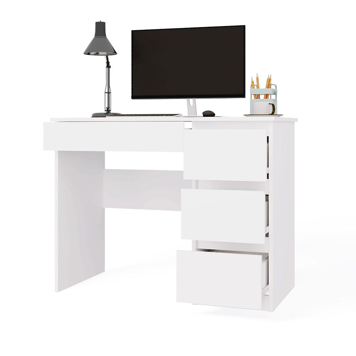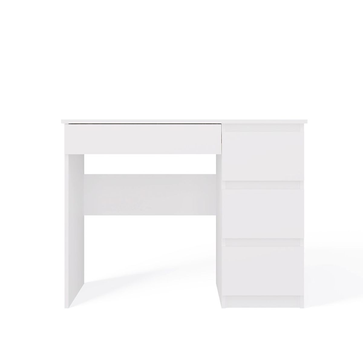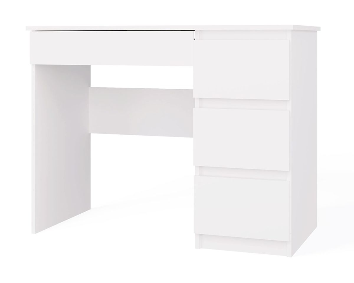 CULOARE: ALB Modelul de birou „MIJAS” este perfect atât pentru acasă, cât și pentru birouri. Loc ideal pentru un laptop fronturi de sertar fără mânere 3 sertare înalte spațioase în stânga și unul jos în dreapta sub blat funcționalitate design simplu și modern creează un spațiu de lucru confortabil laterale netede fără capace asamblare ușoară instrucțiuni de asamblare în pachet producător ceh (dacă doriți, pot adăuga un „producător polonez” - scrieți ce preferați) MATERIAL: Corp și fronturi - PAL laminat 16 mm.