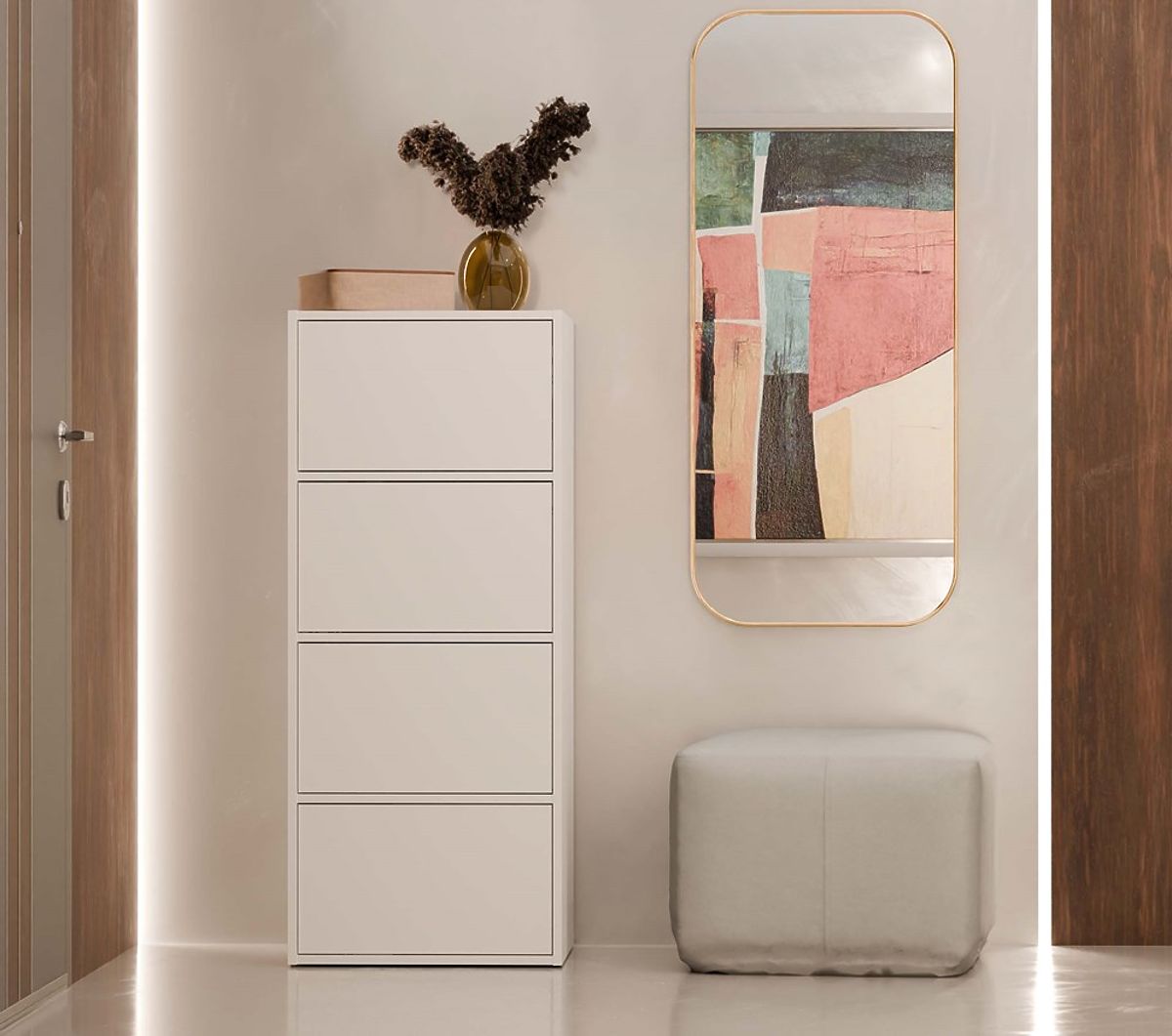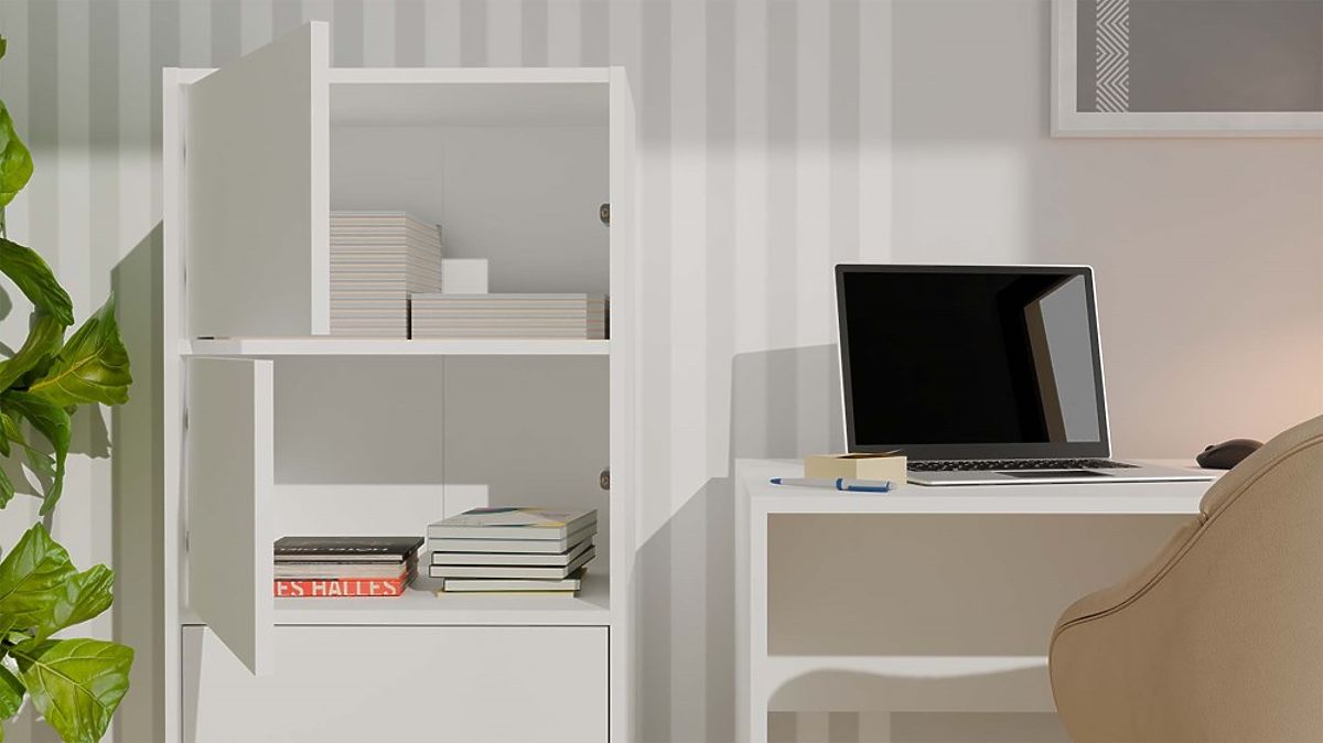 Datorită rafturilor spațioase ascunse în spatele ușilor netede, comoda oferă mult spațiu de depozitare și facilitează menținerea ordinii în orice spațiu.