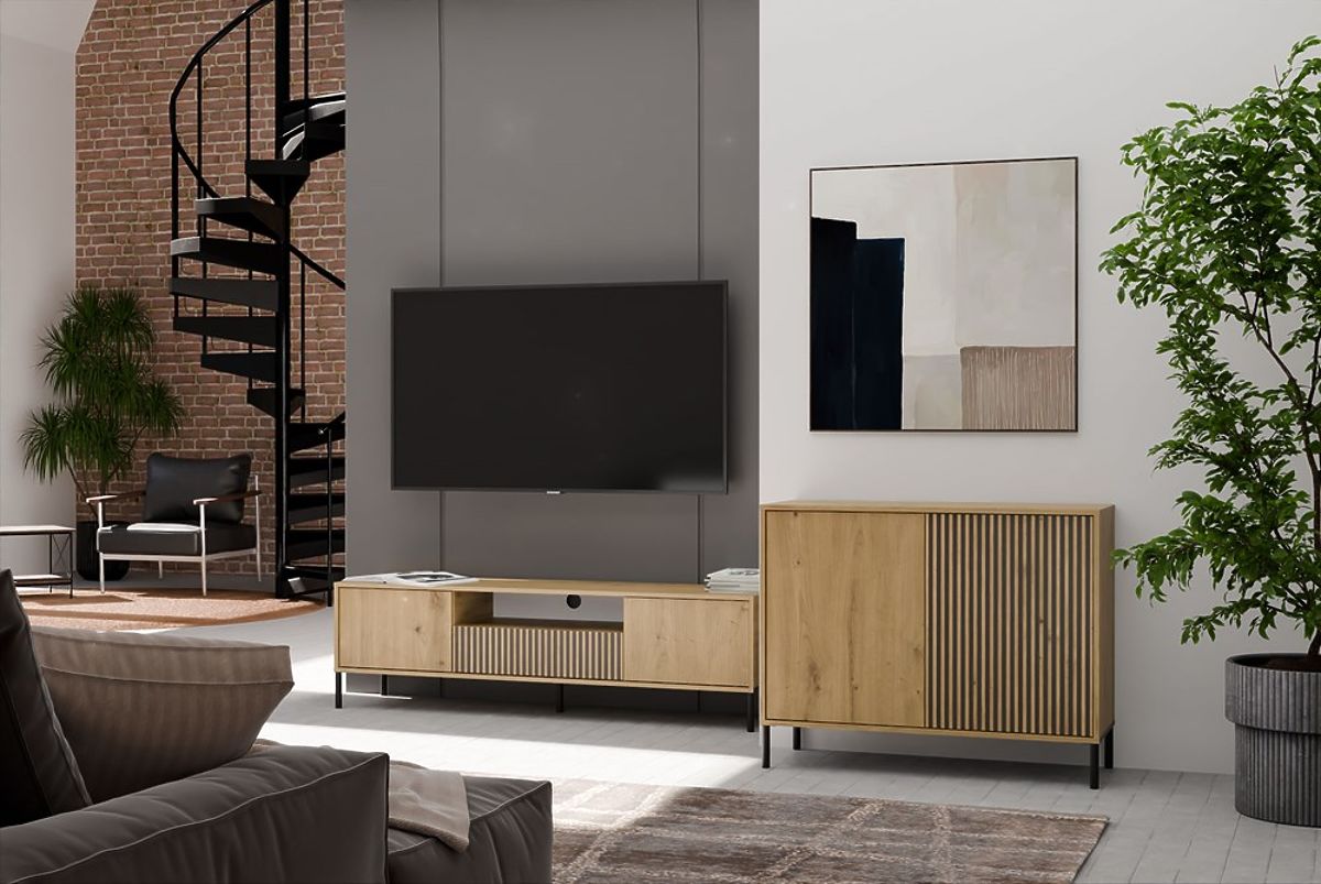 Comoda KAMARO 2D SLIM/NETED DUB ARTISAN este o combinație de estetică și funcționalitate, perfectă pentru sufragerie, cameră de oaspeți, dormitor sau birou. Datorită fațadei canelate a uneia dintre uși (asemănătoare cu lamelele), mobilierul capătă un aspect modern și original, care se potrivește perfect în interioarele moderne.
