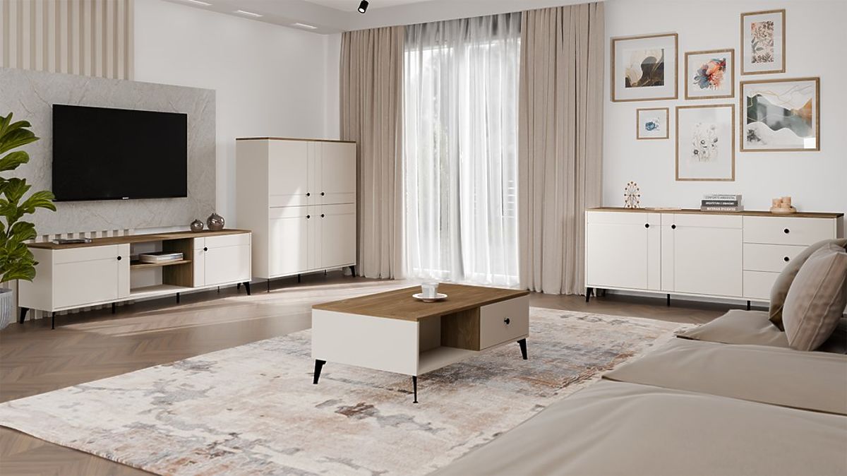 Comoda POINT 4D este o alegere pentru cei care apreciază stilul, funcționalitatea și calitatea superioară a execuției. Combinația dintre nuanța modernă de cașmir și decorul natural al blatului Stejar Castello conferă mobilierului un caracter atemporal, potrivit atât pentru interioare moderne, cât și clasice.